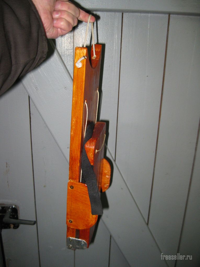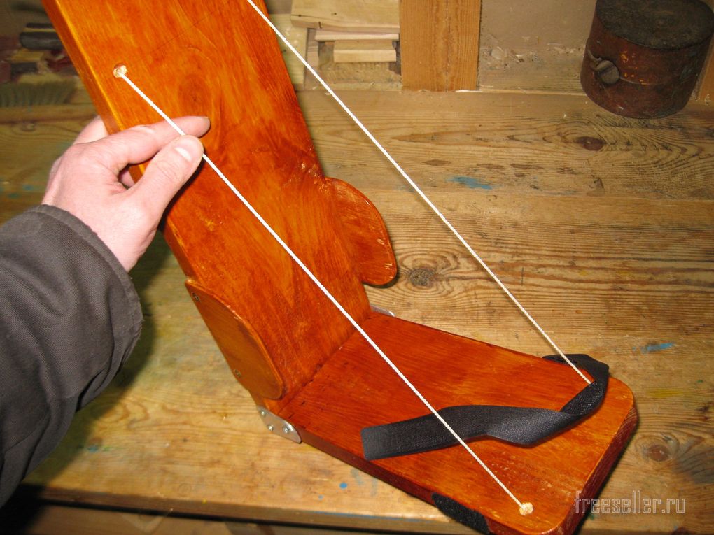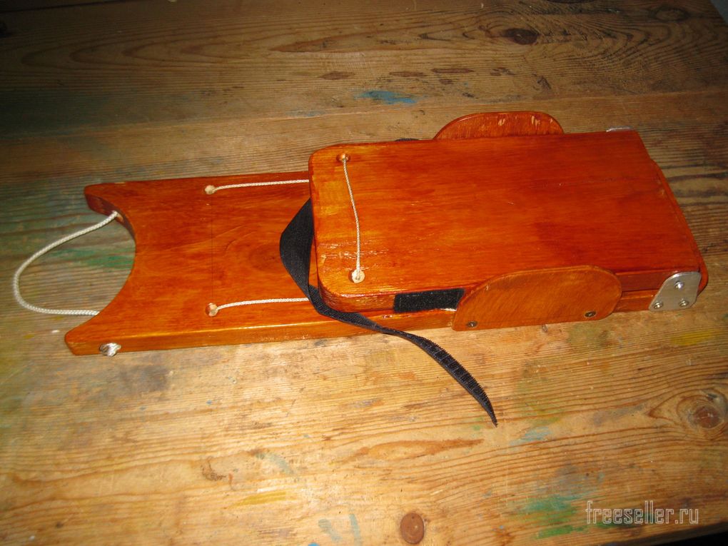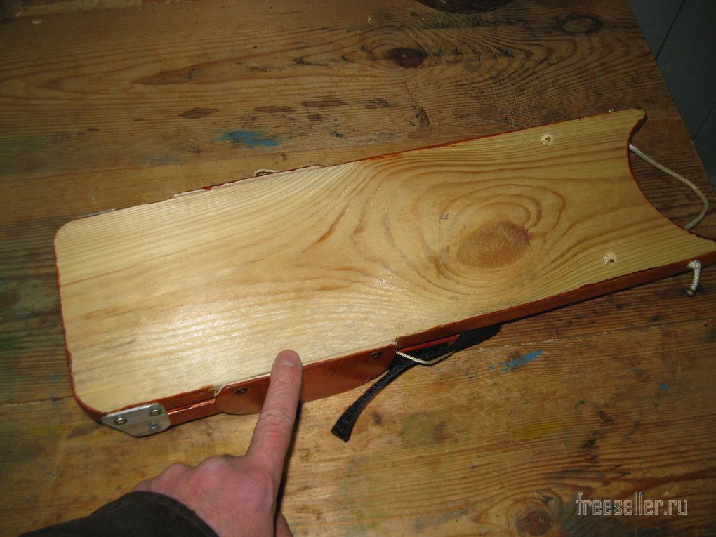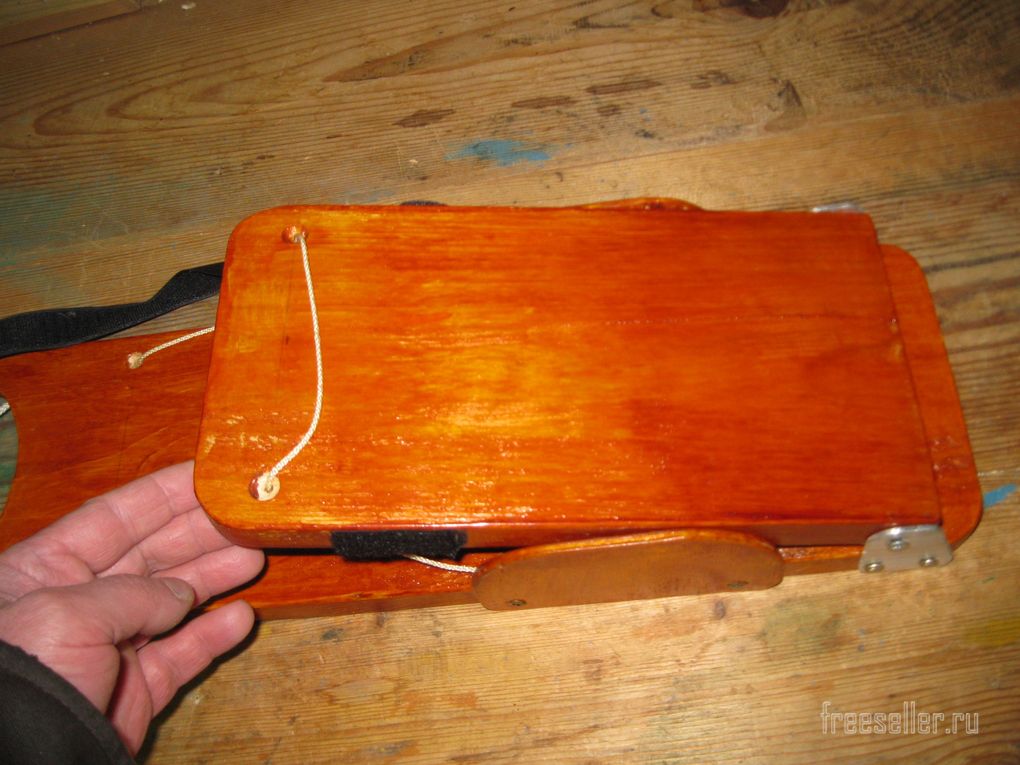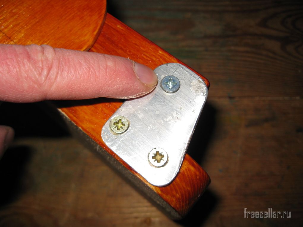 Кроме того, при помощи электролобзика выпилил два вот таких отрезка тонкой фанеры и прикрутил их шурупами к данной дощечке снизу.