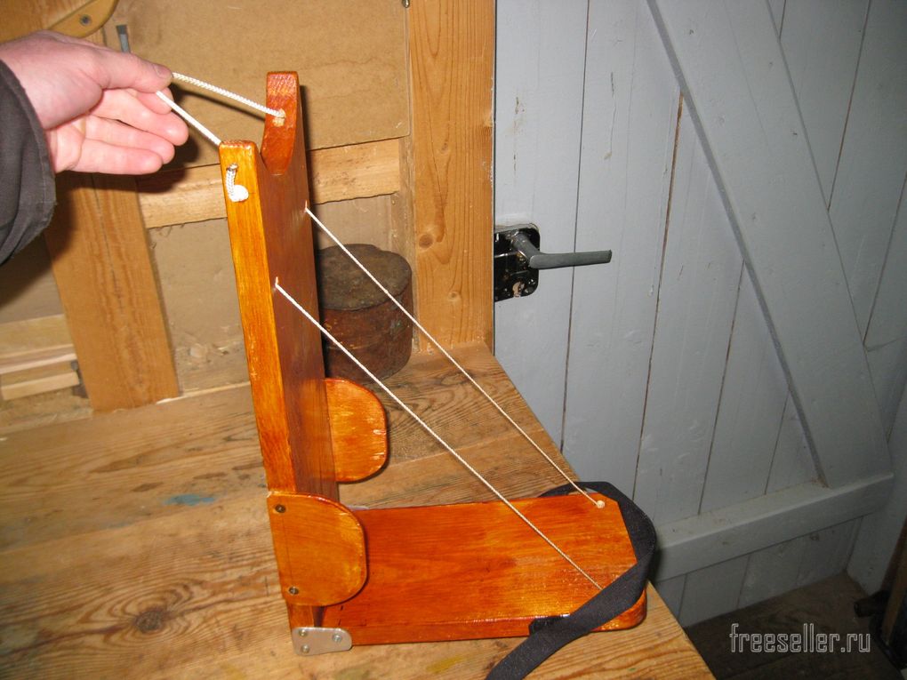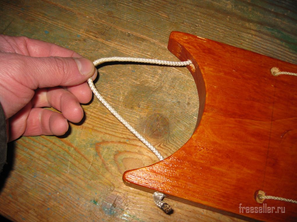 Ну, а затем окончательно собрал данный держатель, смонтировав на нем веревки, то есть собственно отрезок веревки вверху, который будет служить вешалкой и отрезок более тонкой веревки, по бокам, который будет служить для раскладывания держателя в рабочее состояние под прямым углом.