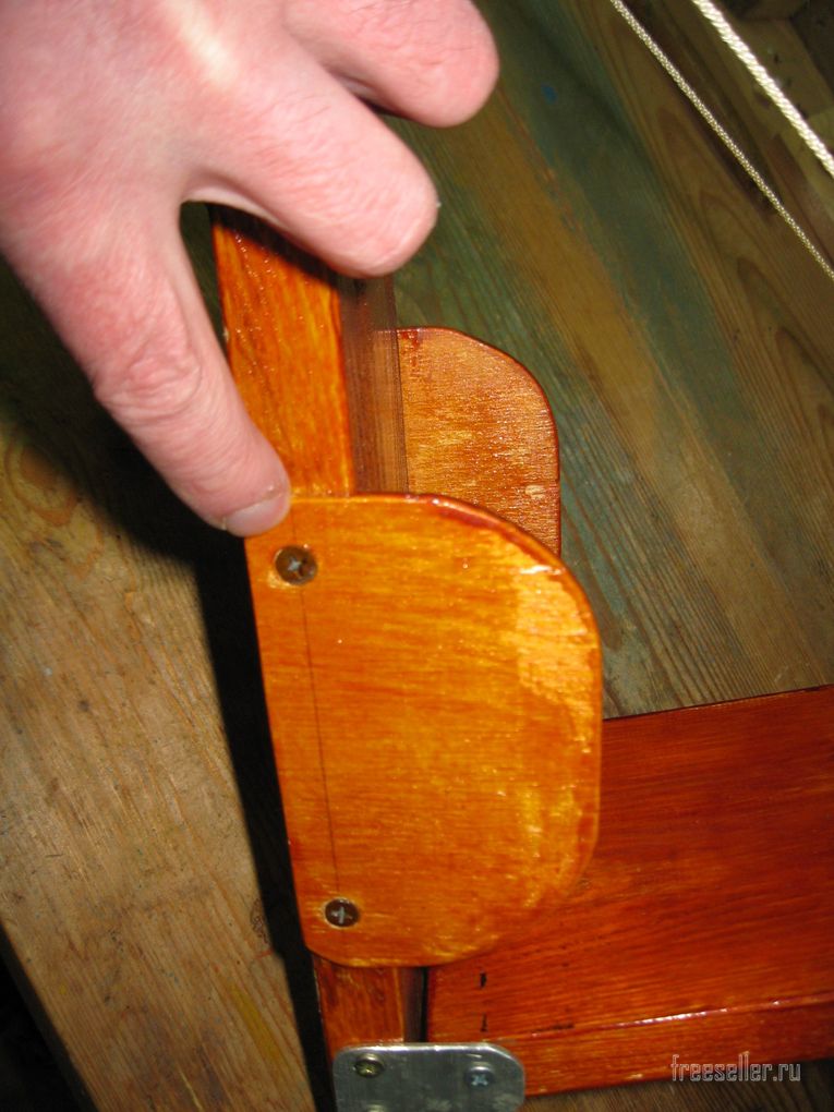 Таким образом, у меня получилось шарнирное соединение, в результате чего, нижняя дощечка-полка, может вращаться относительно верхней вертикальной дощечки.