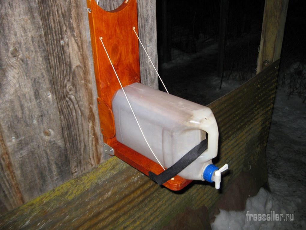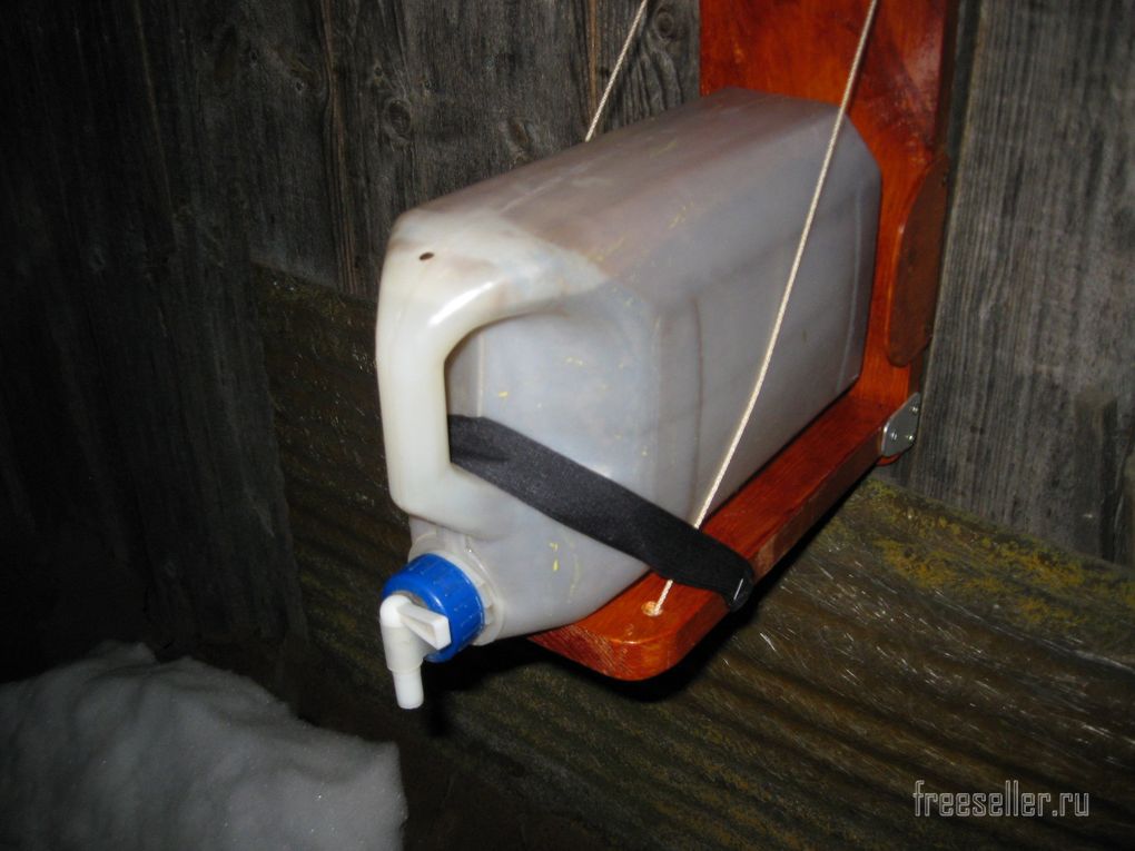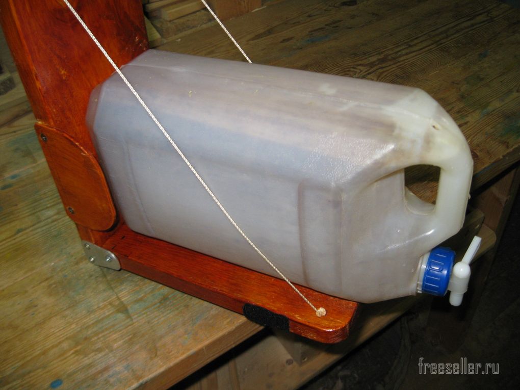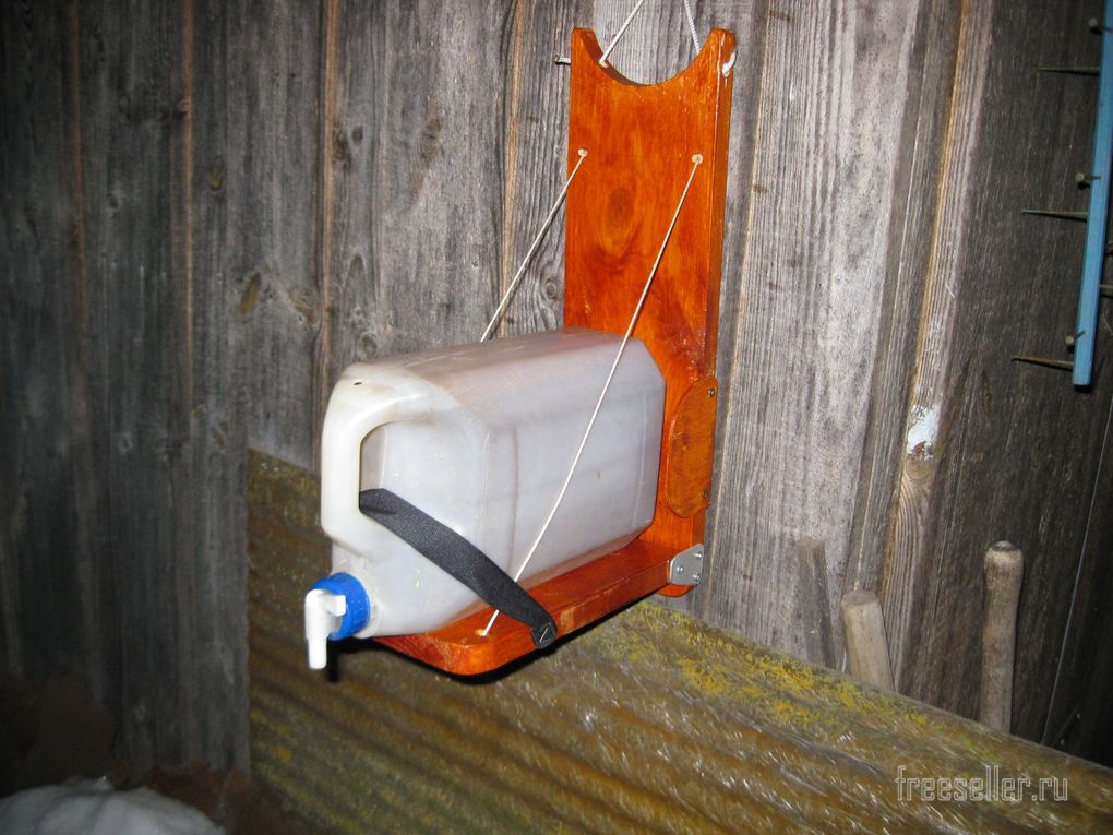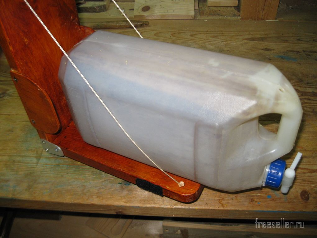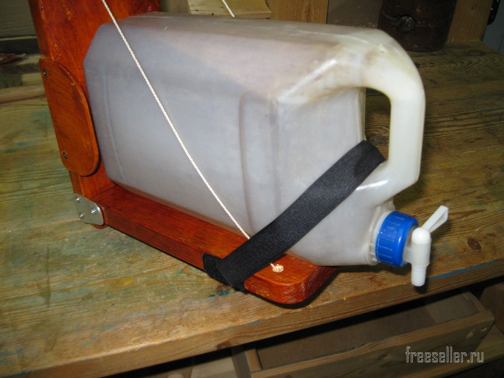Как видно, чтобы пользоваться таким умывальником, необходимо сделать для канистры специальную полку, а лучше всего – переносной держатель, который можно было бы вешать в разных местах, например, во дворе на стену дома или сарая, в саду или дома в ванной комнате. При этом желательно, чтобы такой держатель был еще и складной и достаточно компактный для его удобного хранения.