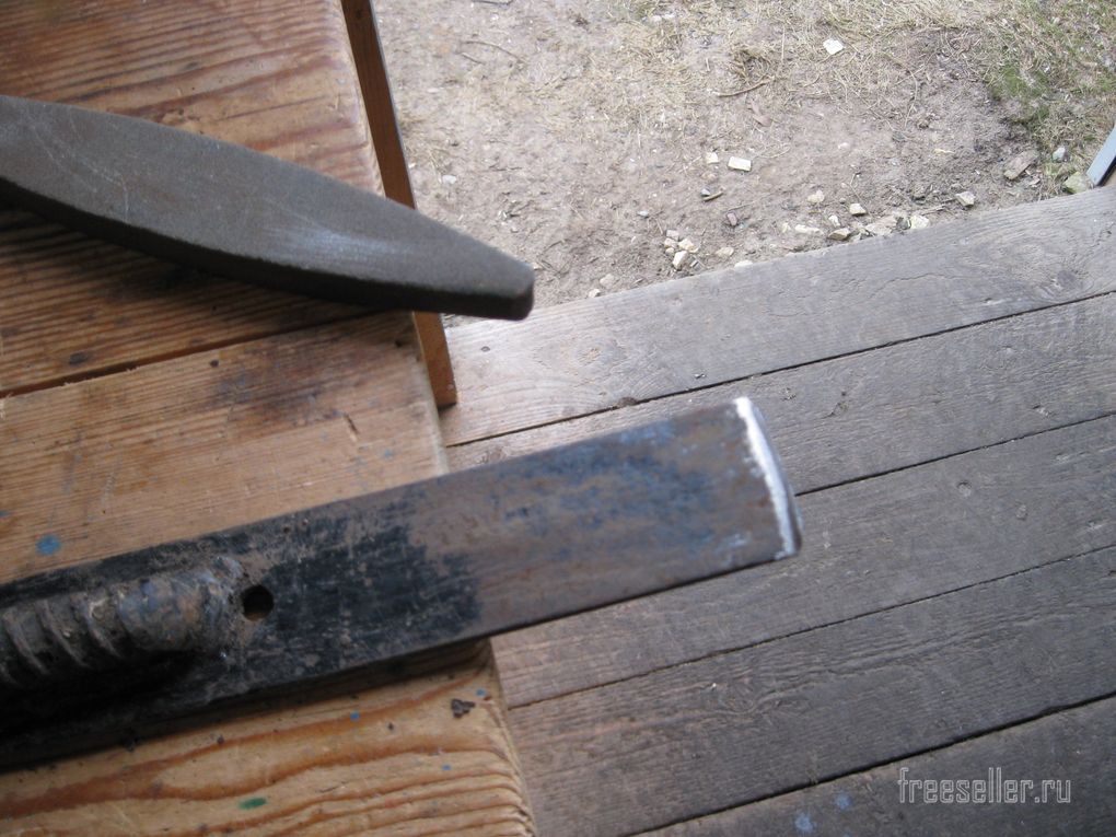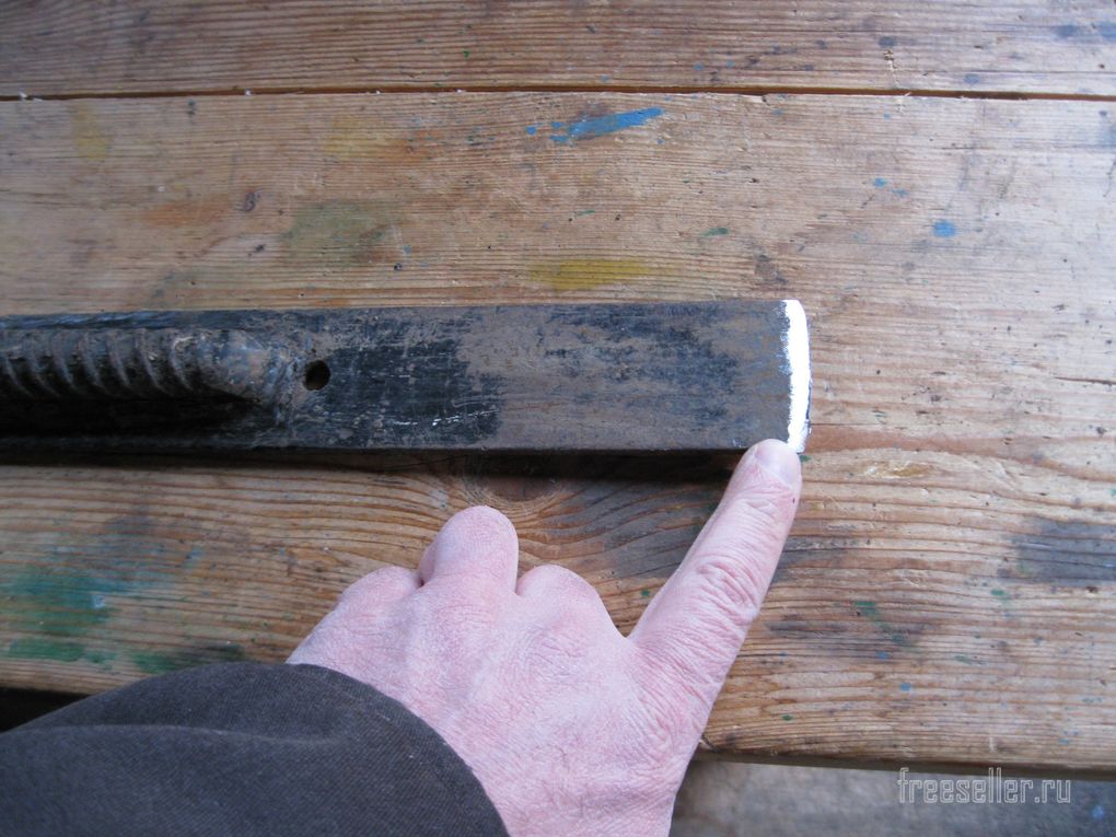 Для этого рабочая часть инструмента кладется на подходящий деревянный брусок, сечением 10х10 см, а его рукоятка прижимается к земле ногой. Таким образом, можно достаточно легко и быстро заточить этот инструмент.