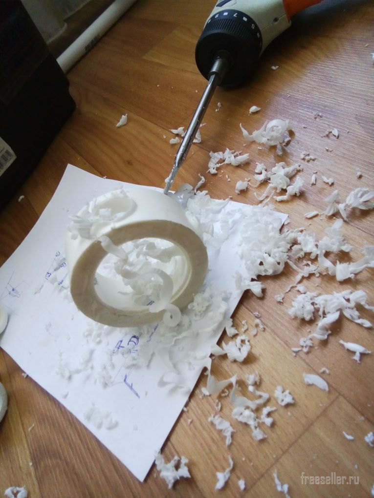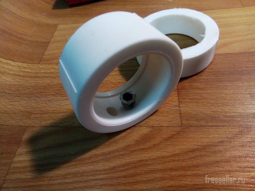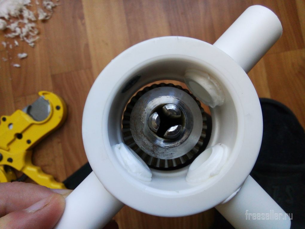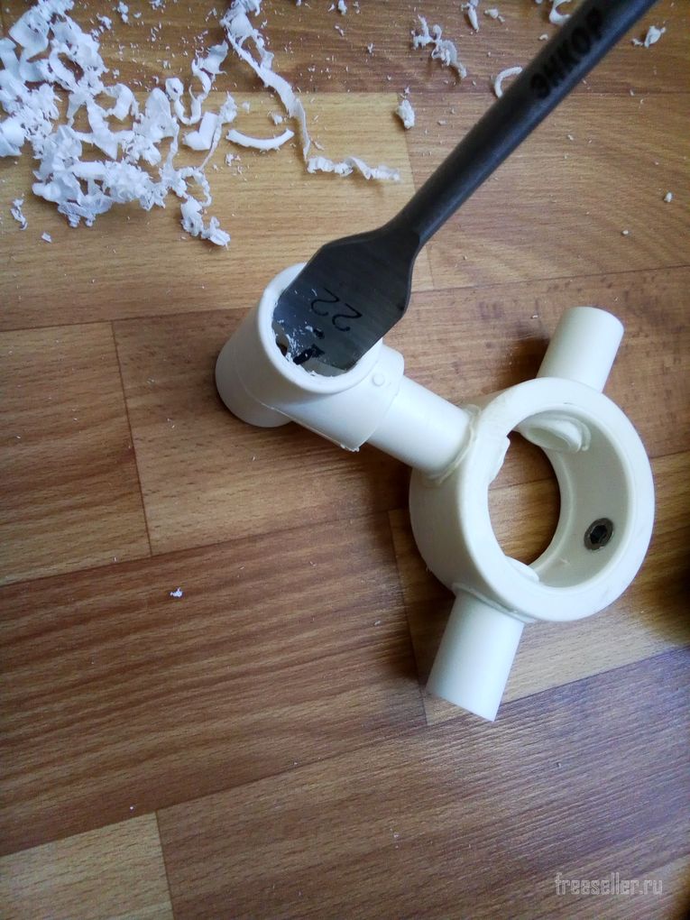 Сборку стойки начал с держателя для дрели, для чего распилил полипропиленовую муфту на 50 мм и врезал туда мебельную шайбу.