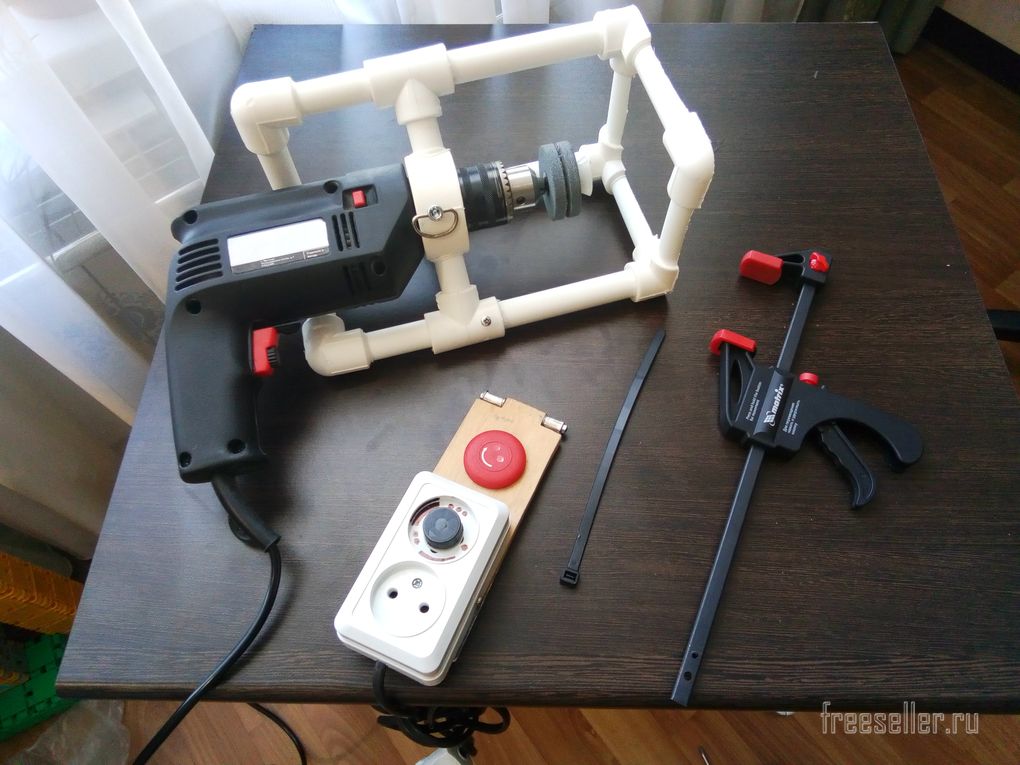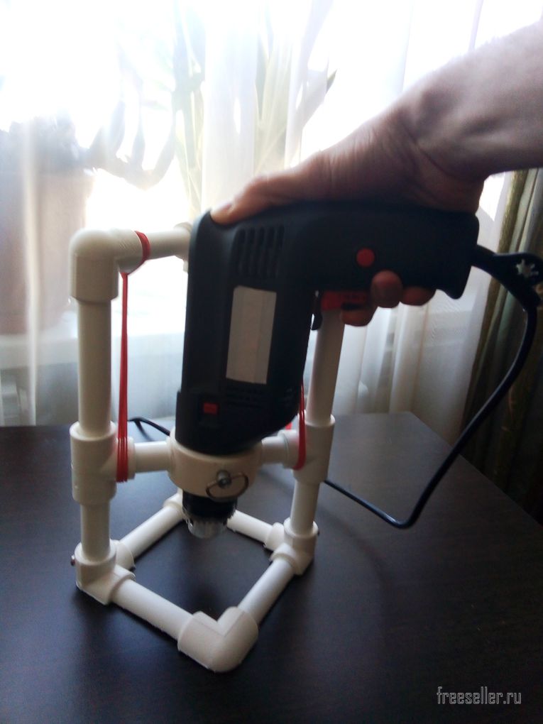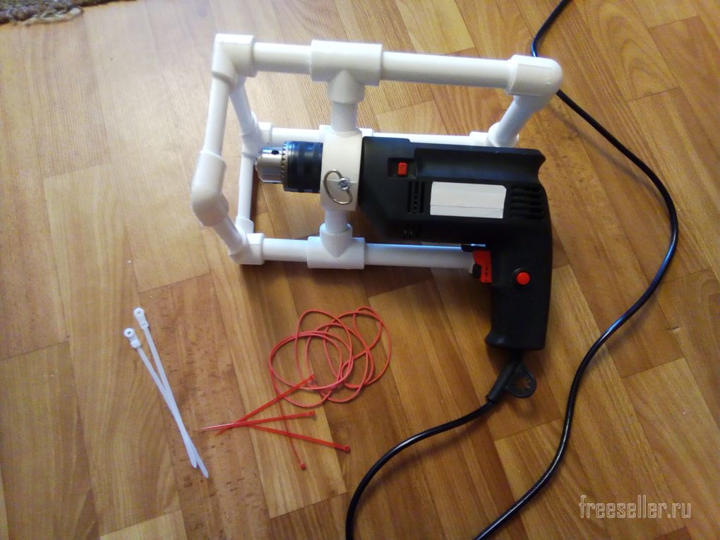убрать резинки, заблокировать кнопку или зафиксировать хомутом, установить винт для фиксации положения дрели влево - вправо и использовать скобы для крепления стойки к столу. Для запуска дрели я использую свою старую самоделку - педаль типа "лягушка"