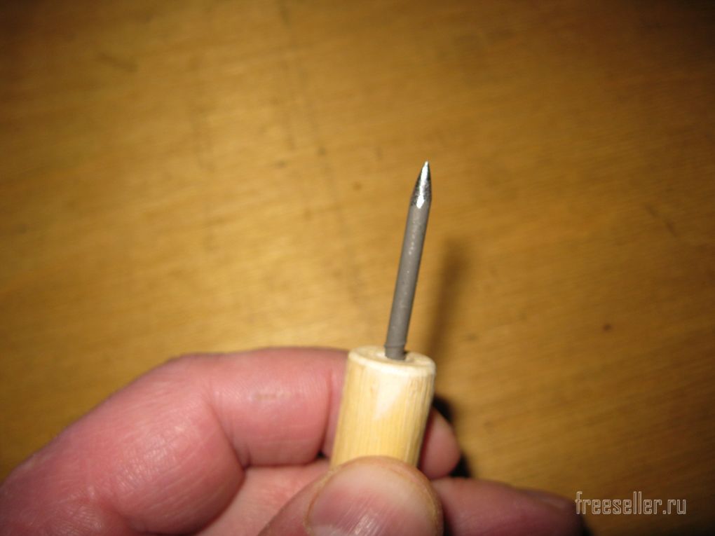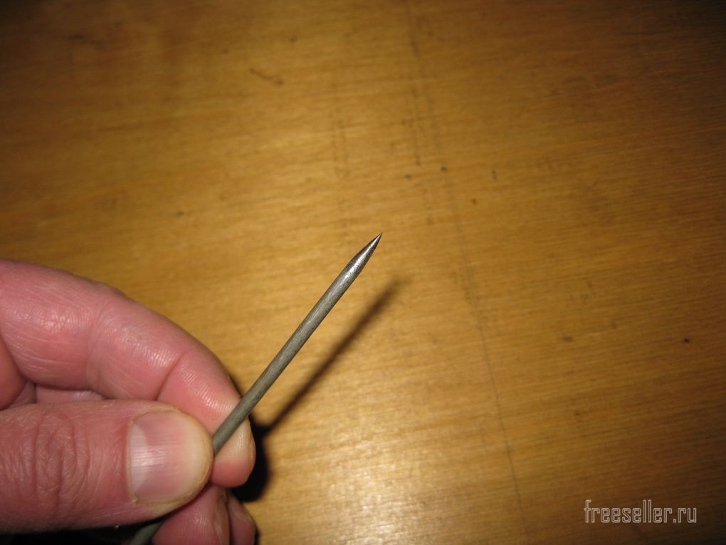 С одной стороны я заточил это шило на электроточиле, причем сделал его граненым и в виде довольно длинного конуса для того, чтобы можно было проплавлять разные по диаметру отверстия.