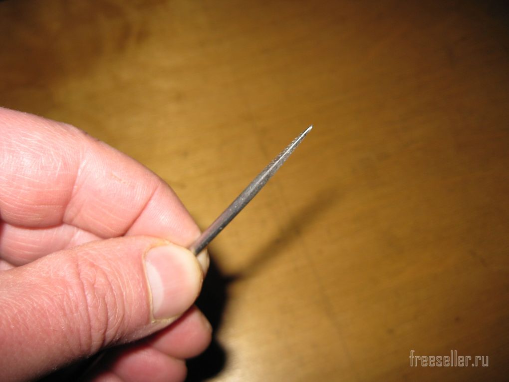 И после этого, на электроточиле сточил головку у этого шурупа, а сам кончик шурупа заострил в виде шила.