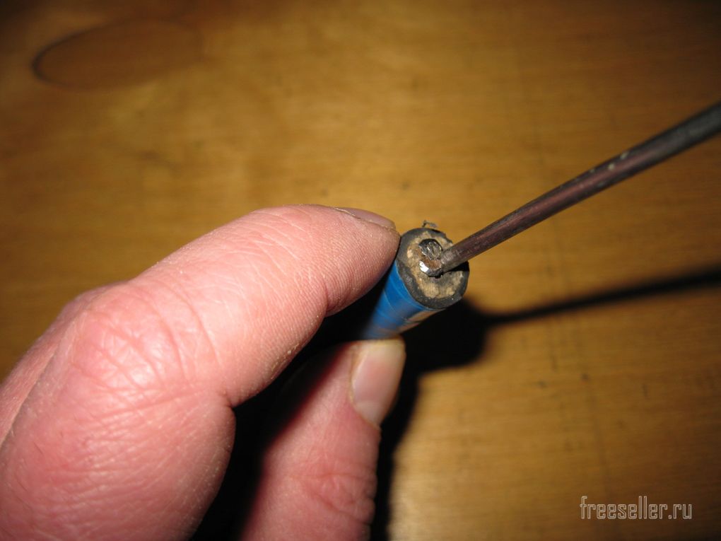 Для этого, я взял подходящий отрезок сухой ветки длиной 10-12 см, и просверлил в нем с одного торца, по центру, вдоль продольной оси, глухое отверстие диаметром 3 мм, и глубиной 6-7 см.