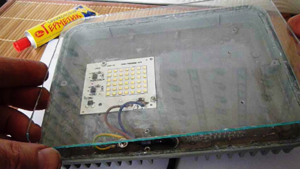 Ремонт прожектора основан на замене светодиодной матрицы на 30 Вт со встроенным драйвером, питающейся от сети 220 В.Также пришлось вырезать новое стекло для прожектора.