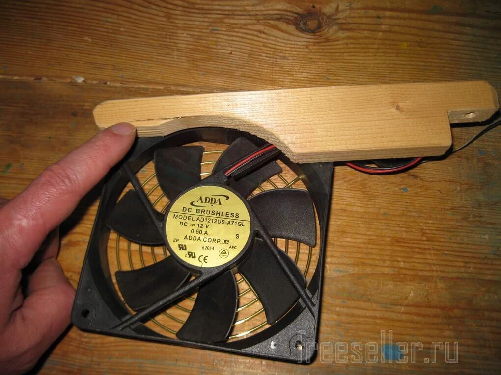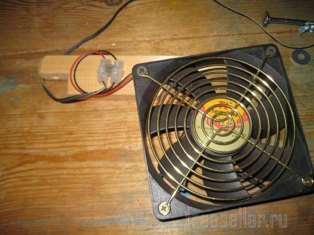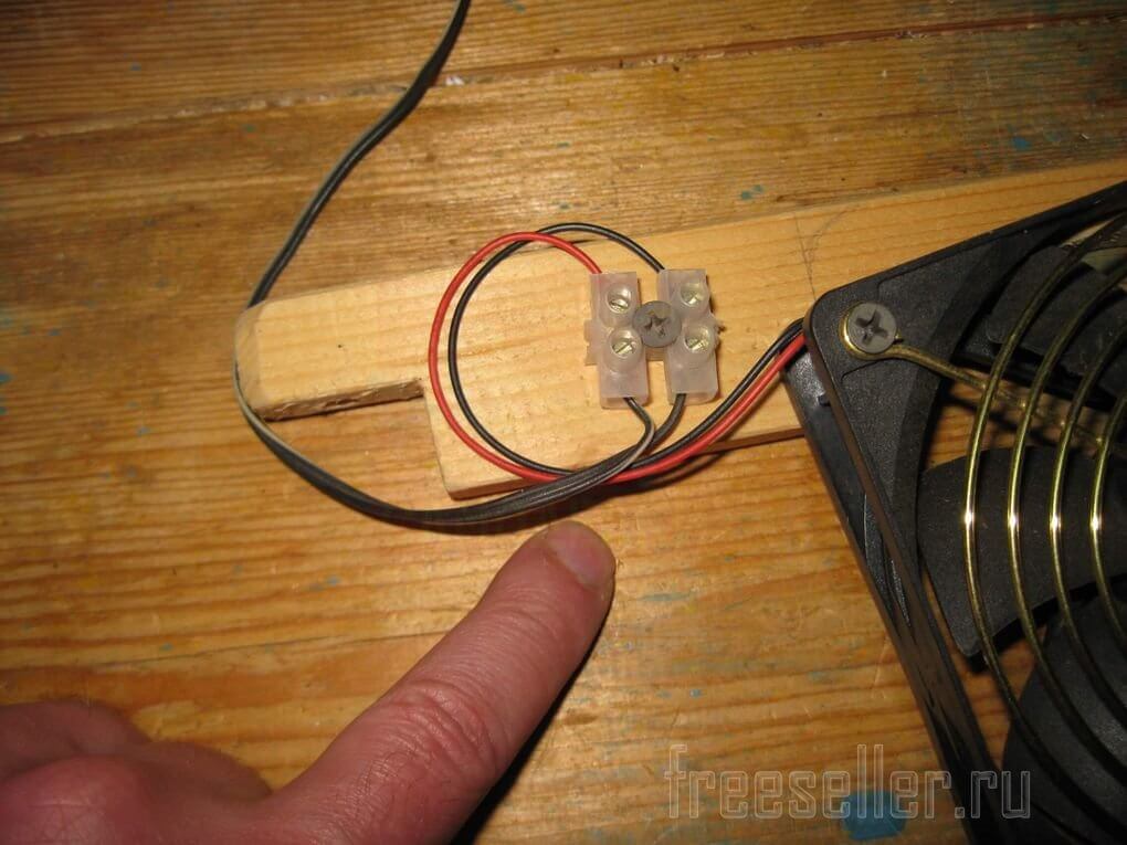 Затем прикрепил кулер к этому отрезку дощечки, при помощи шурупов, а рядом прикрепил клеммник, при помощи которого соединил провода кулера и адаптера.