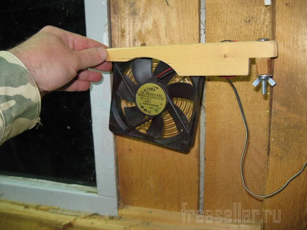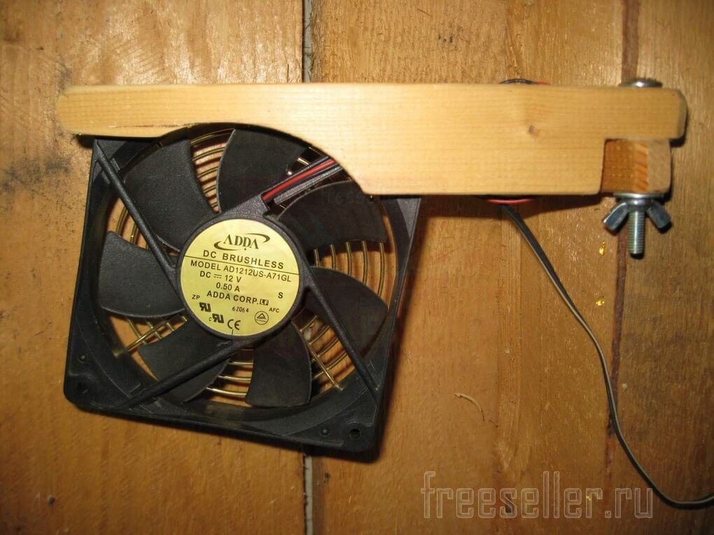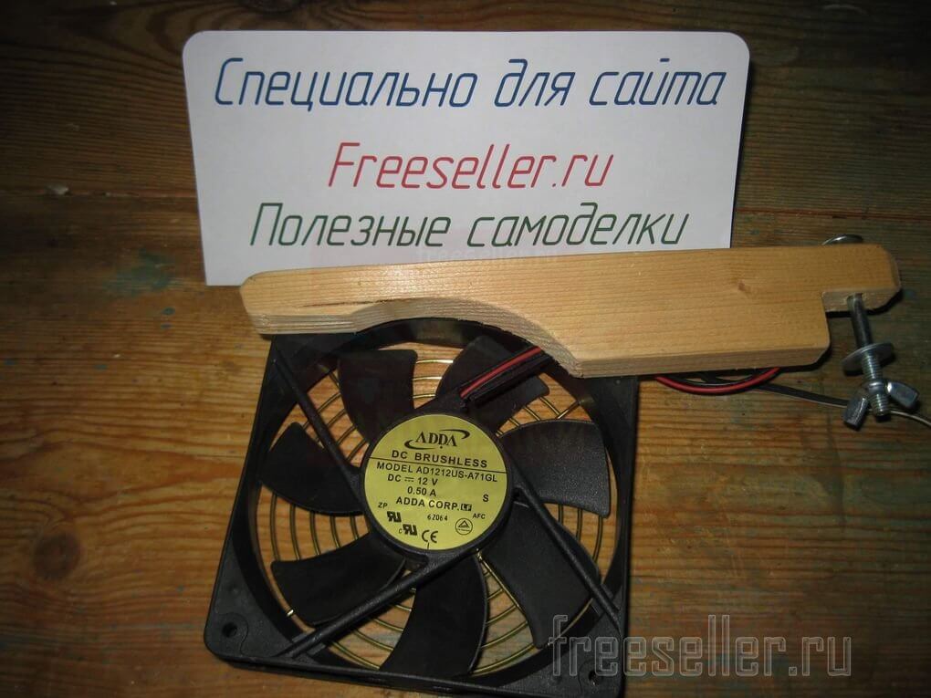 Простейший самодельный вентилятор для мастерской, сделанный из кулера от сгоревшего блока питания настольного компьютера и адаптера на 12 вольт.
