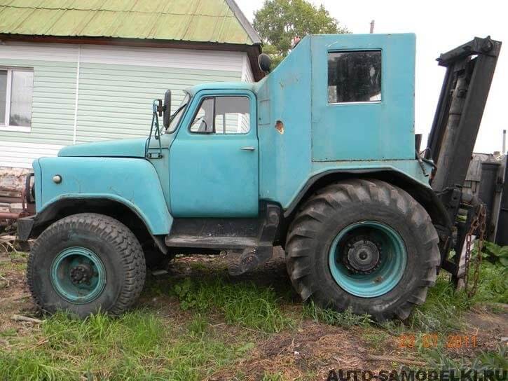 Самодельный трактор-погрузчик из запчастей от старой сельхоз техники, с полным приводом, задний мост использован от трактора Т-150, передний мост от армейского грузовика ГАЗ-66.