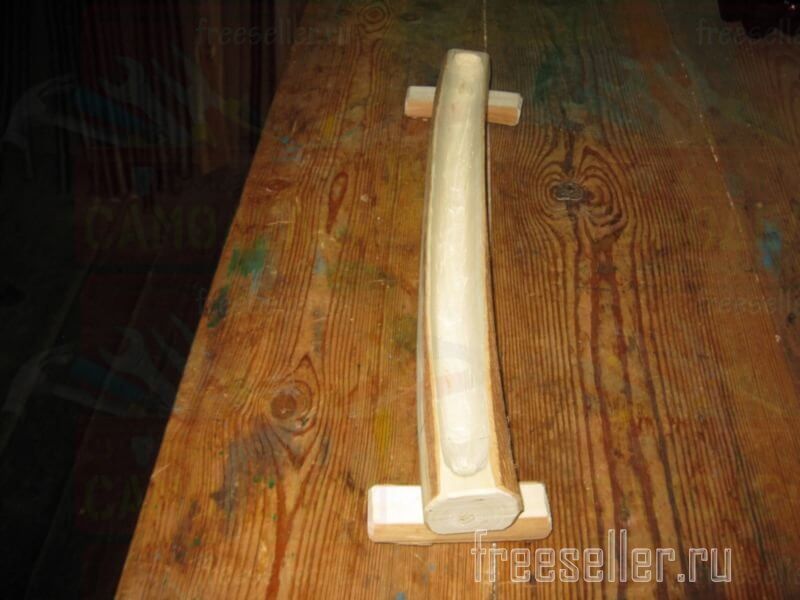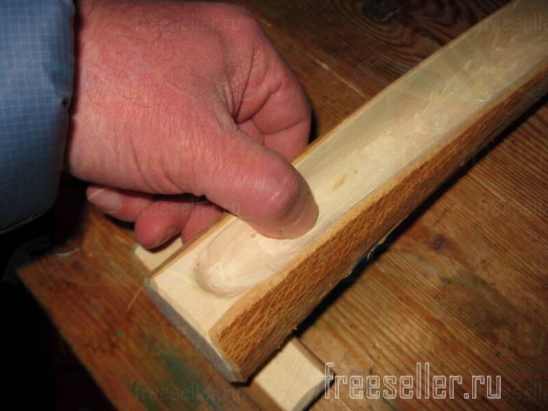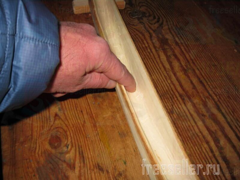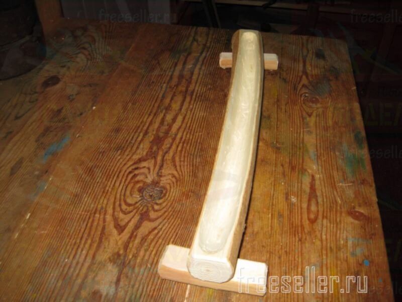 После этого, при помощи полукруглой стамески и молотка, я выдолбил внутри этого обрезка глубокий желоб. В этот желоб и будет засыпаться сухой корм.