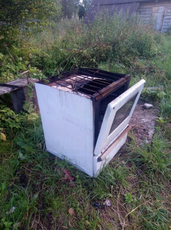 Чтобы сделать из нее очаг достаточно срезать болгаркой верхнюю часть с комфорками и прорезать в духовке отверстие для выхода дыма.