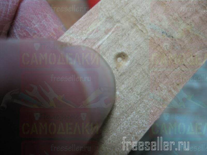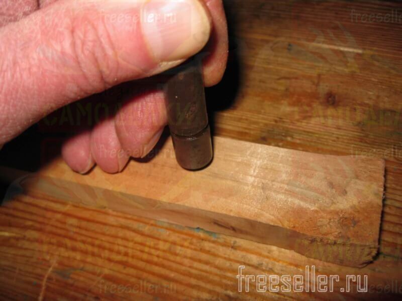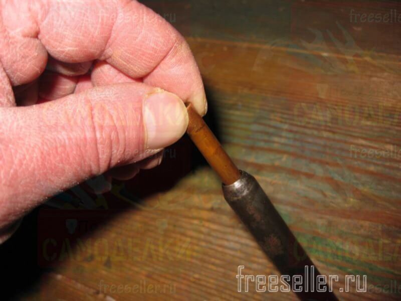 Затем возьмем самый мягкий материал – отрезок деревянной дощечки. Установив на него кернер острием, и оттянув медную трубочку, накерним на поверхности древесины метку.