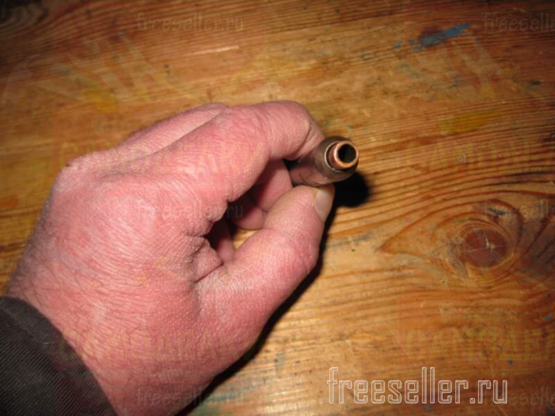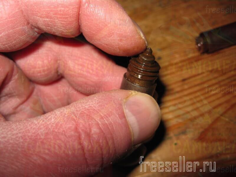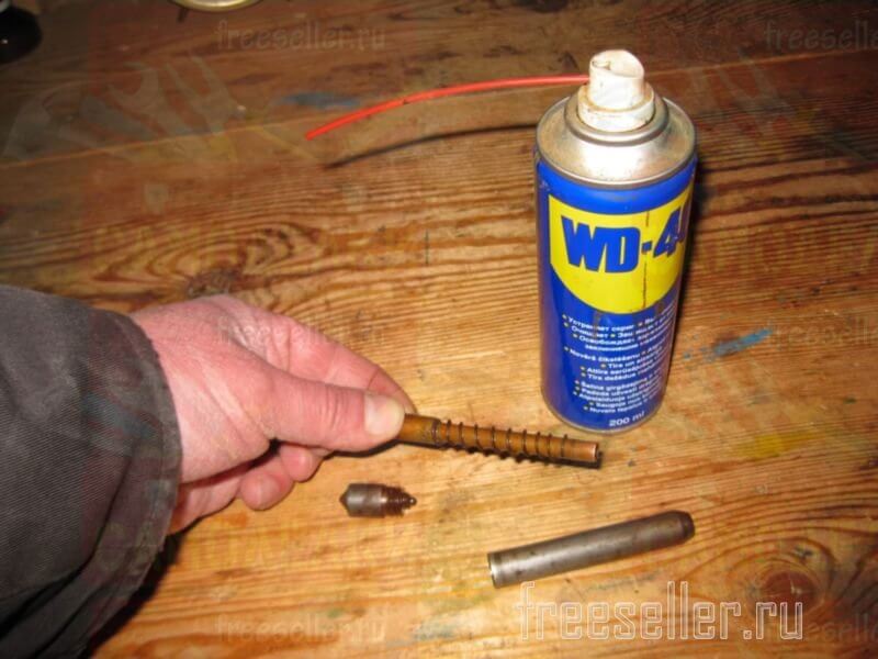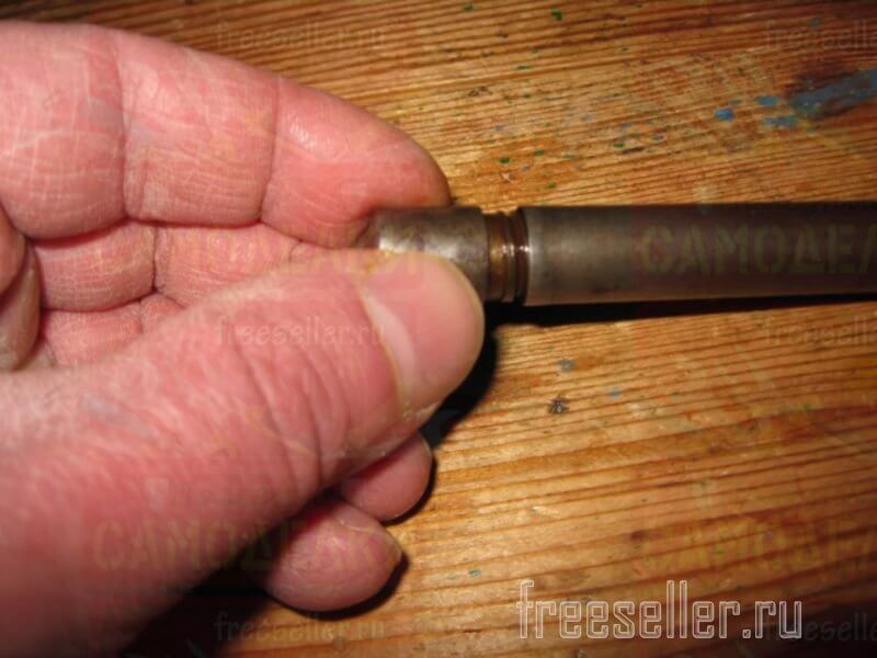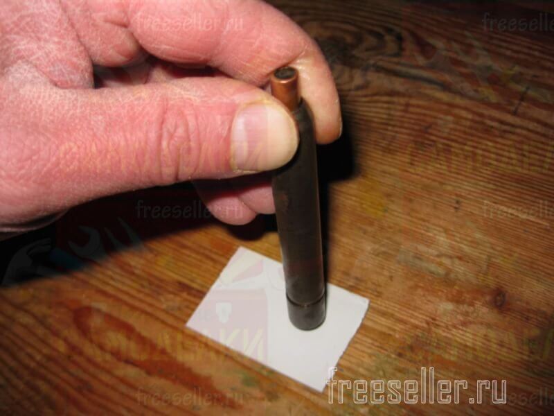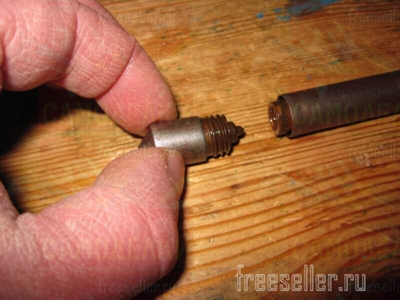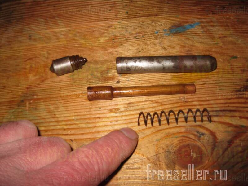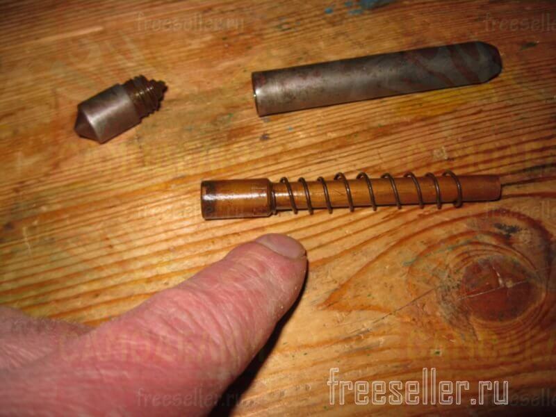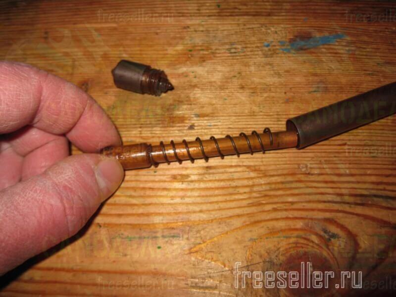 Отсоединив от корпуса головную часть, достаем из корпуса медную трубку с пружиной.