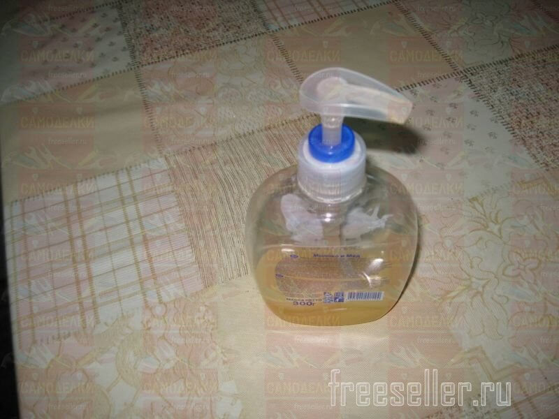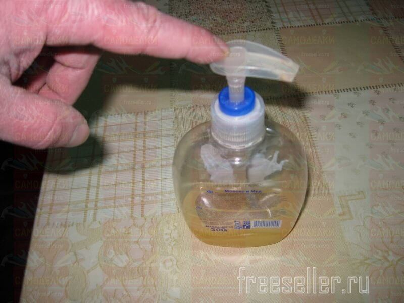 Для того чтобы выдавить порцию жидкого мыла, нужно просто слегка сжать в руке пластиковую бутылочку.