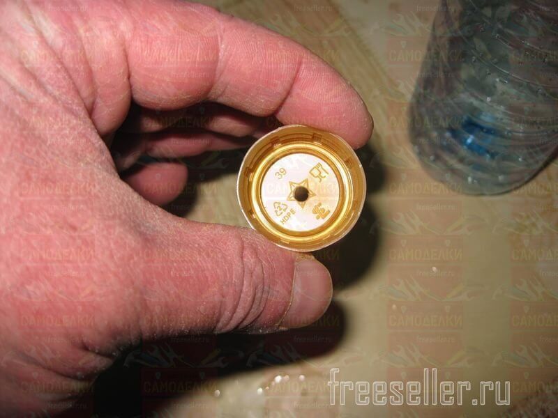 Ну, и в-третьих, мы можем сами регулировать объем выдавливаемой порции жидкого мыла, делая в крышках отверстия разного диаметра.