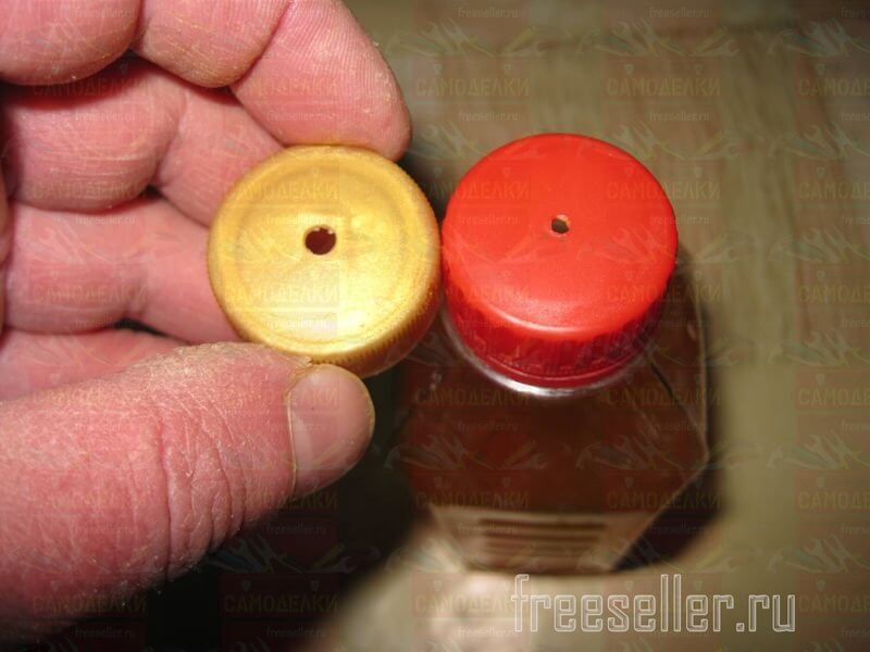 В крышках этих бутылочек, нужно просверлить отверстия небольшого диаметра. Хотя их можно и не сверлить, а просто проплавить разогретым на огне гвоздем.