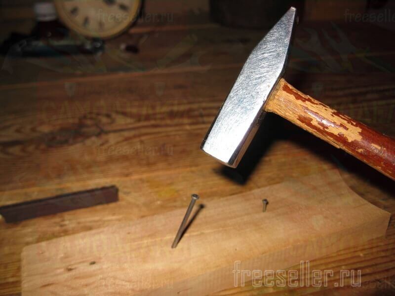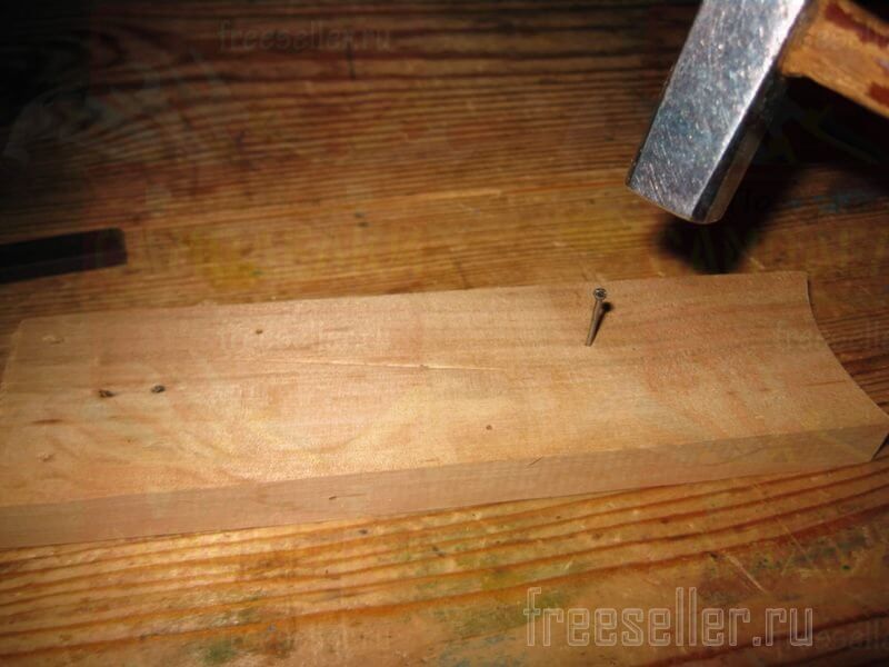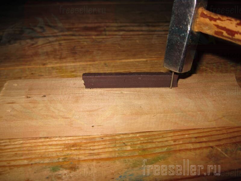 После этого, удерживая одной рукой край полоски, другой рукой делаем несколько ударов молотком по головке гвоздика, надежно наживляя его.