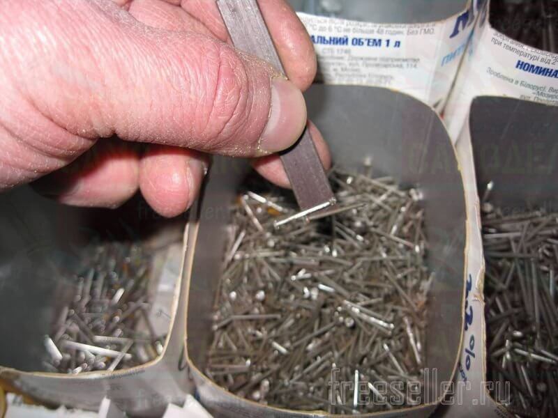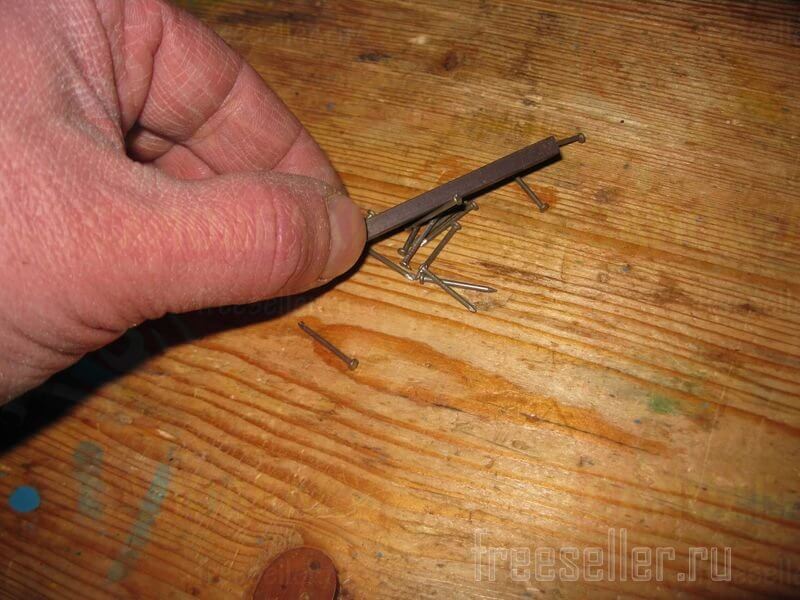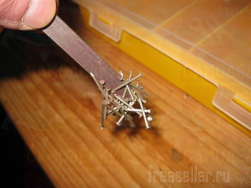 В итоге, все гвоздики примагничиваются к полоске и их остается только стряхнуть в коробку.