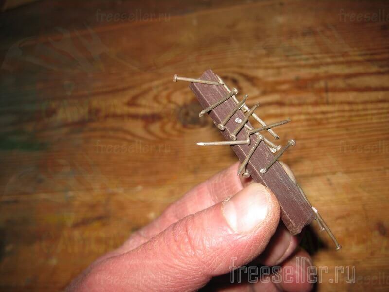 На конце у этого устройства имеется прорезь, в которую вставляется и удерживается маленький гвоздик во время забивания. Таким образом, нам не надо удерживать гвоздик пальцами, рискуя попасть по ним молотком. Надо отметить, что это устройство достаточно удобное и хорошо себя зарекомендовало на практике.