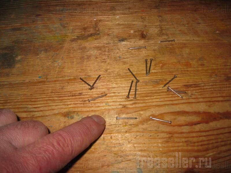 Для этого, просто берем полоску рукой и проводим ей по поверхности верстака, где у нас лежат гвоздики.