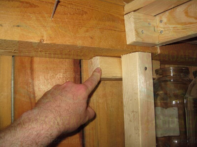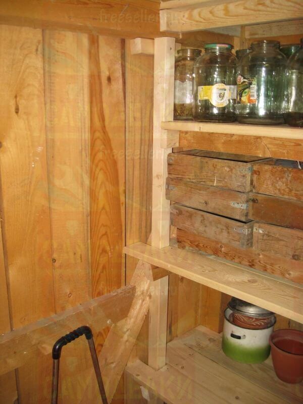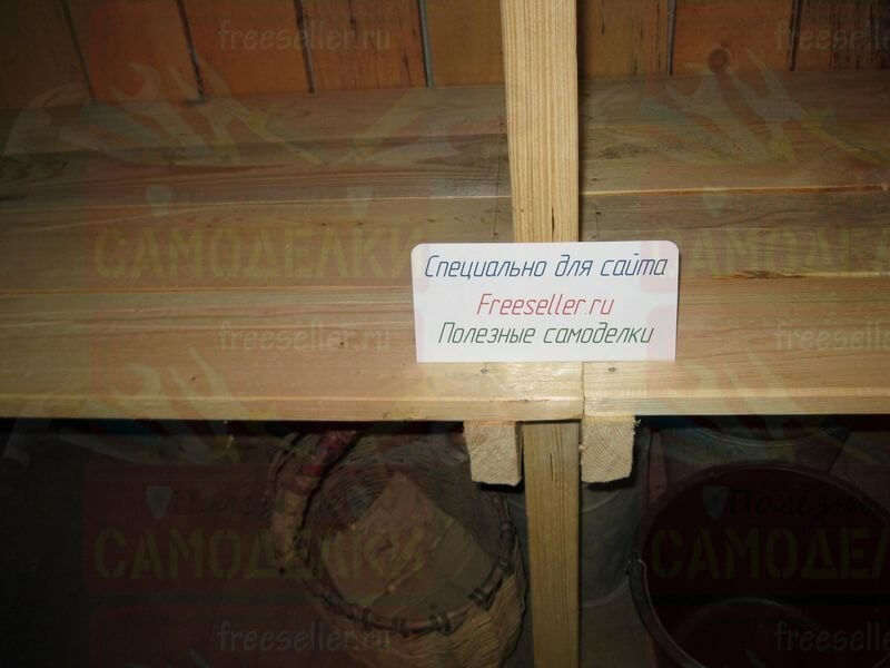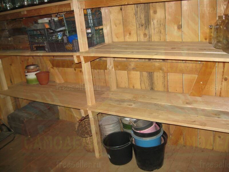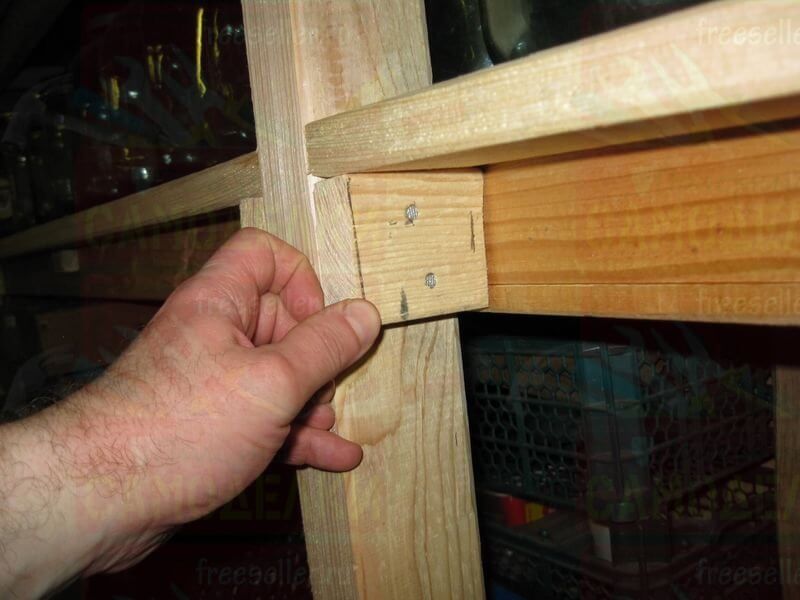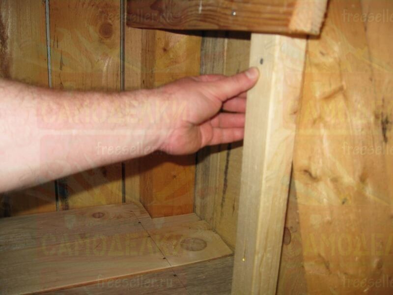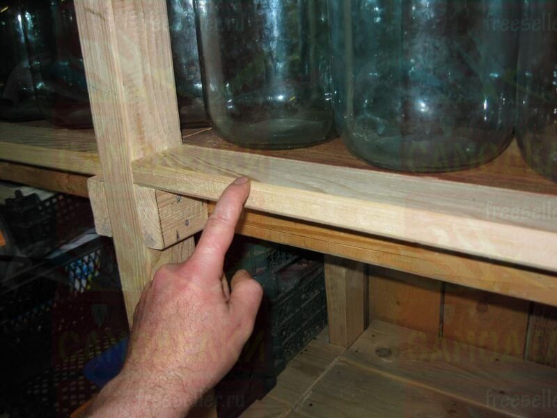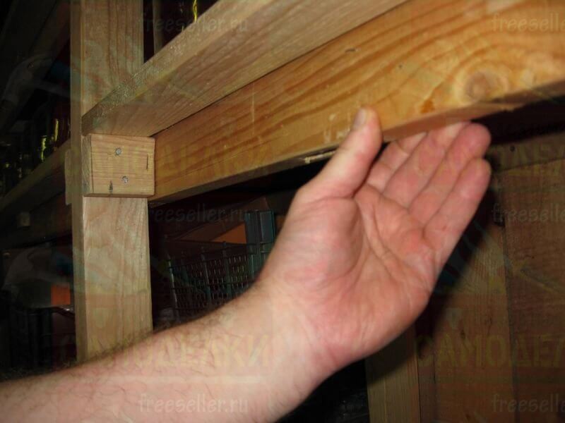 Между каждой боковой стойкой и угловым столбом сарая, на нужной высоте, прибили по четыре горизонтальных перекладины, сделанные из брусков потоньше. На них будут ложиться полки.