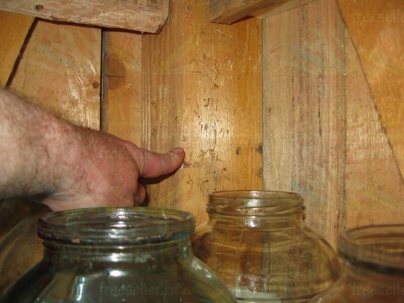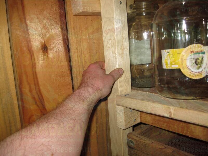 Для крепления задних сторон полок из ДСП, дополнительно прикрутили к стене сарая, небольшие бруски при помощи шурупов.