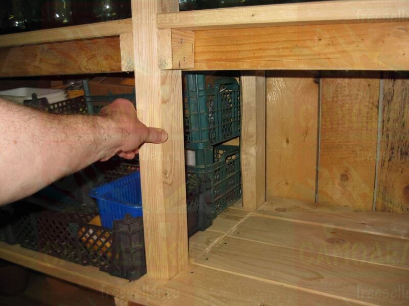 Причем по краям стеллажа, слева и справа поставили только по одной стойке – передней, поскольку в качестве задних стоек используются угловые столбы самого сарая, сделанные из бруса сечением 10х10 см.