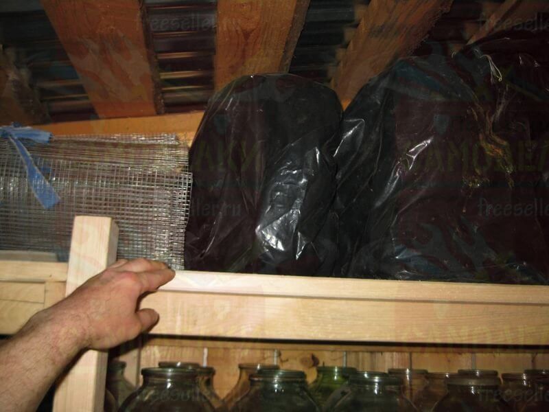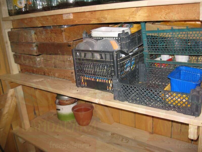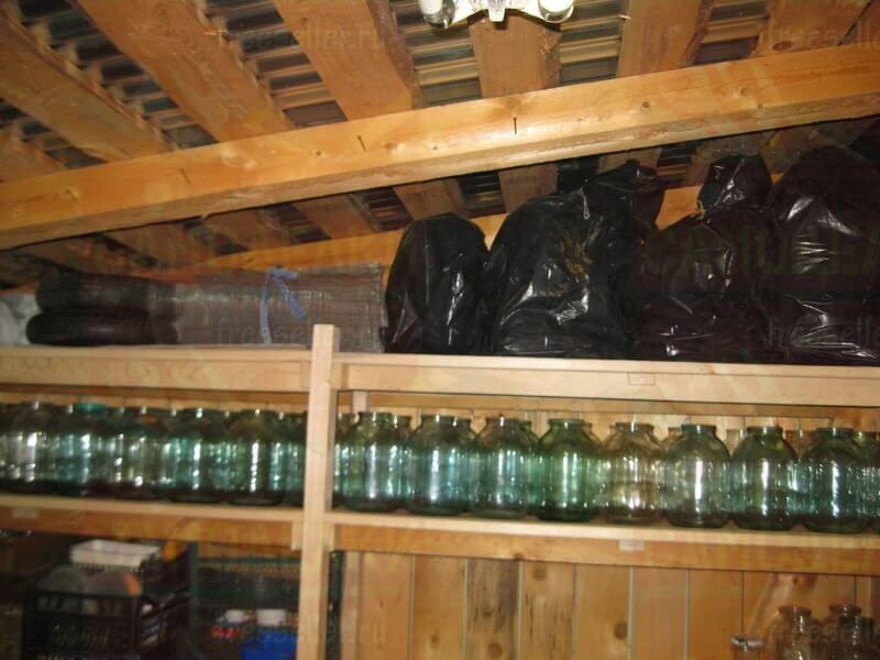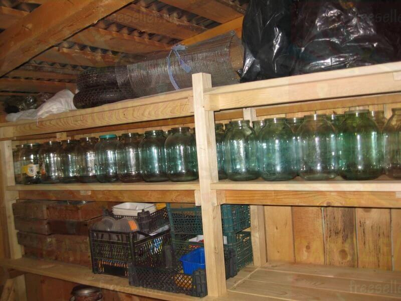 Сделан этот стеллаж был в основном для хранения трехлитровых банок, которых у нас накопилось довольно много, а также для различных садовых принадлежностей, например, ящиков, контейнеров, ведер и т.п.