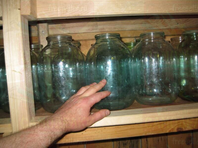 Поэтому на самой удобной для частого использования высоте, то есть на третьей полке, мы разместили трехлитровые стеклянные банки.