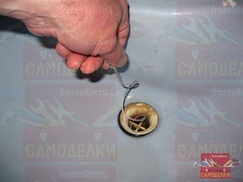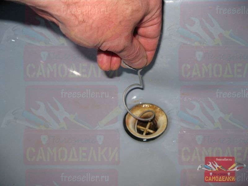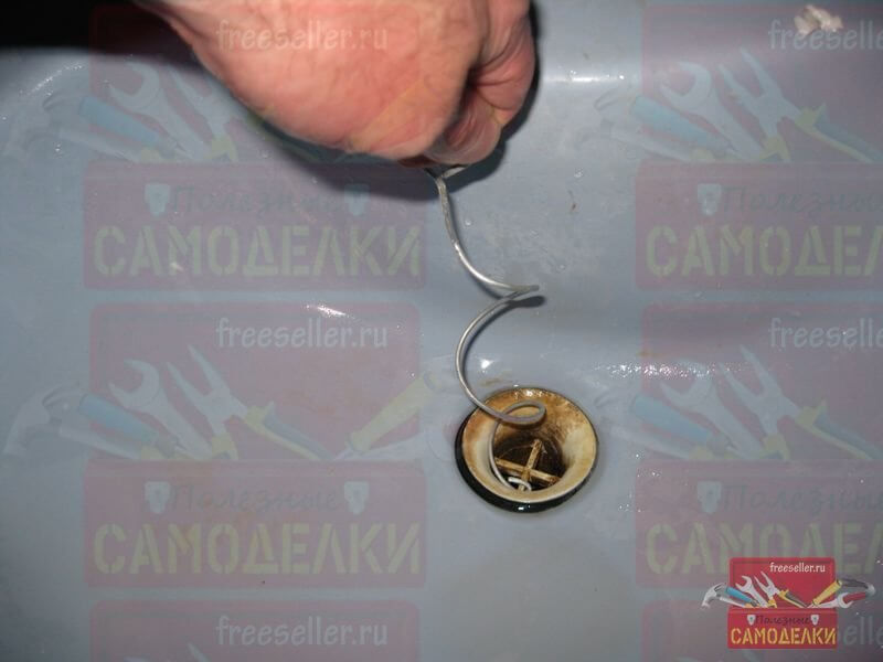 Очень простое самодельное приспособление из отрезка прочной нержавеющей проволоки для чистки верхней части слива раковины, кухонной мойки или ванны.