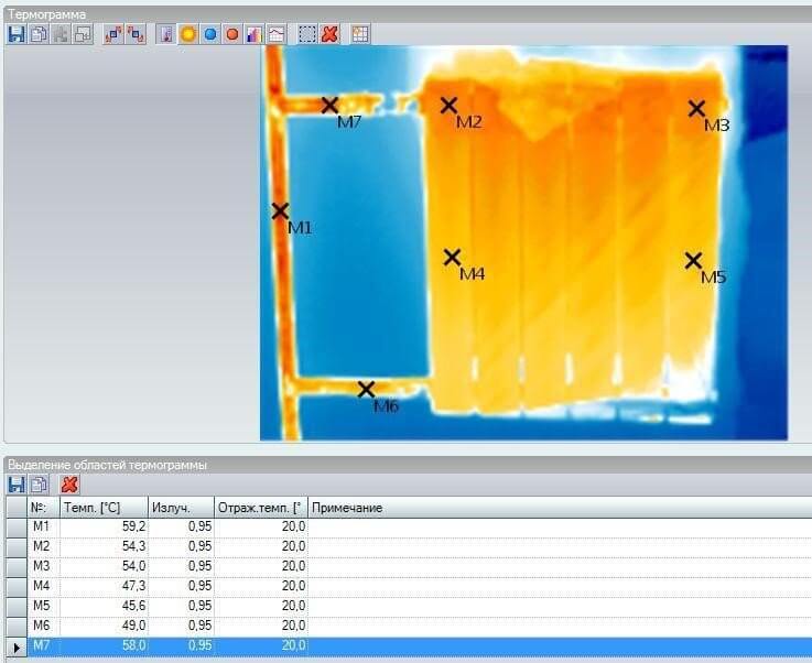 Термограмма радиатора, работающего исключительно на естественной циркуляции.