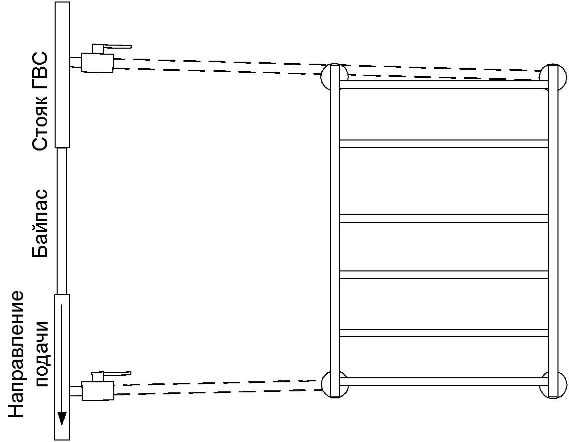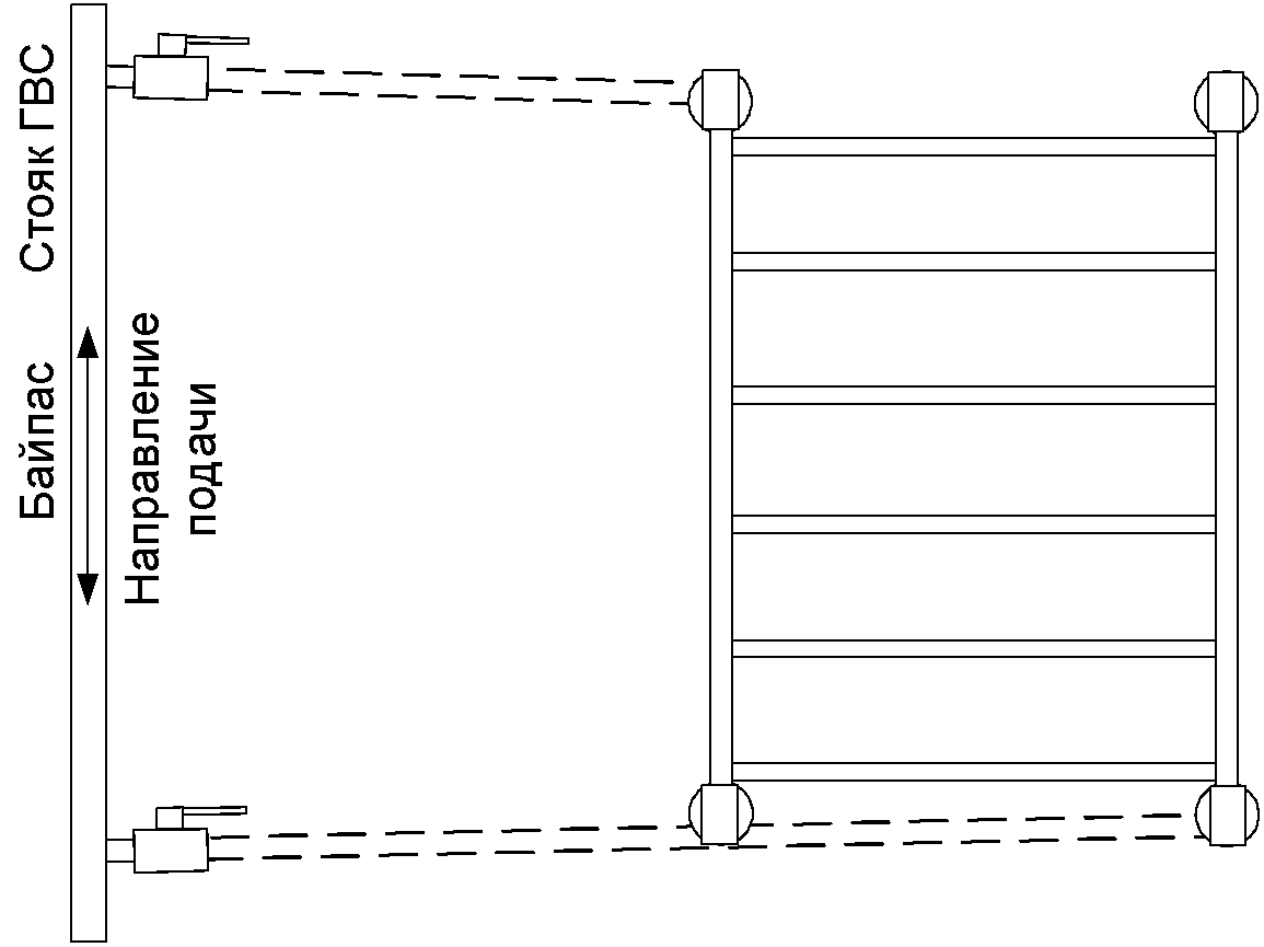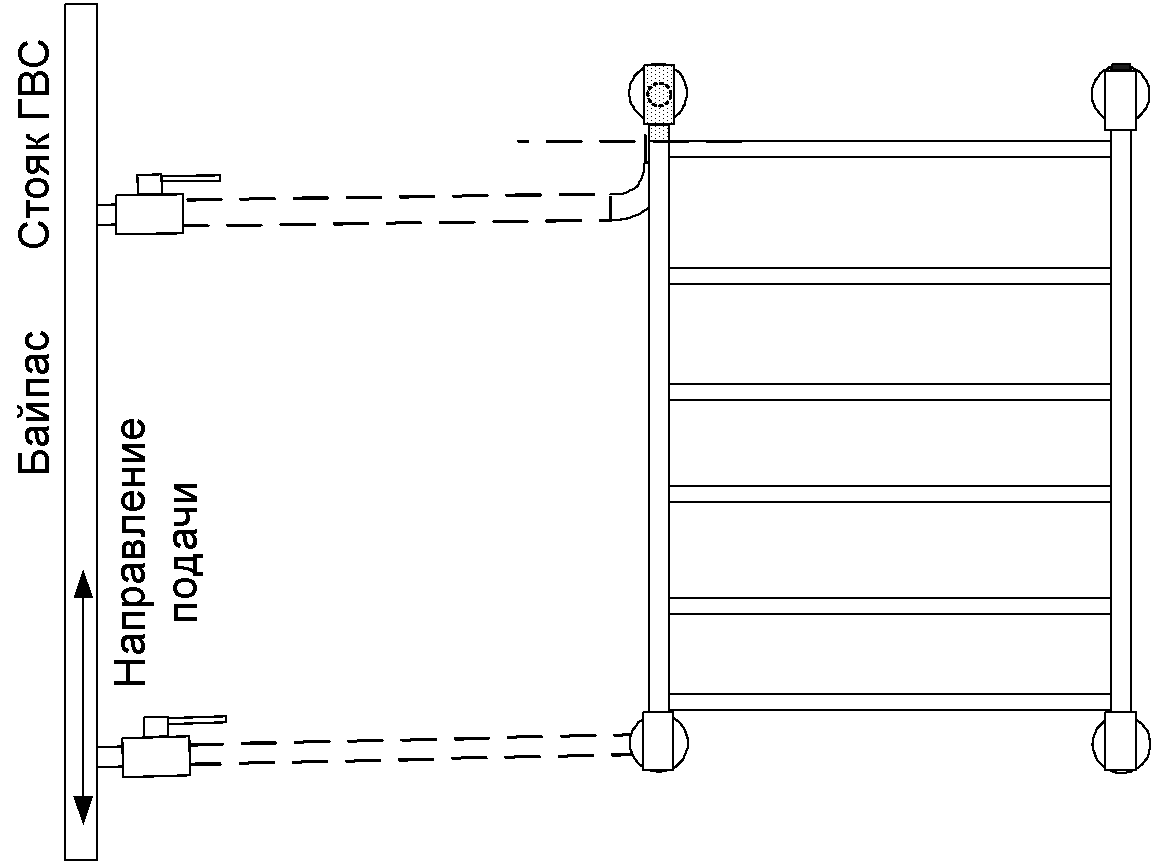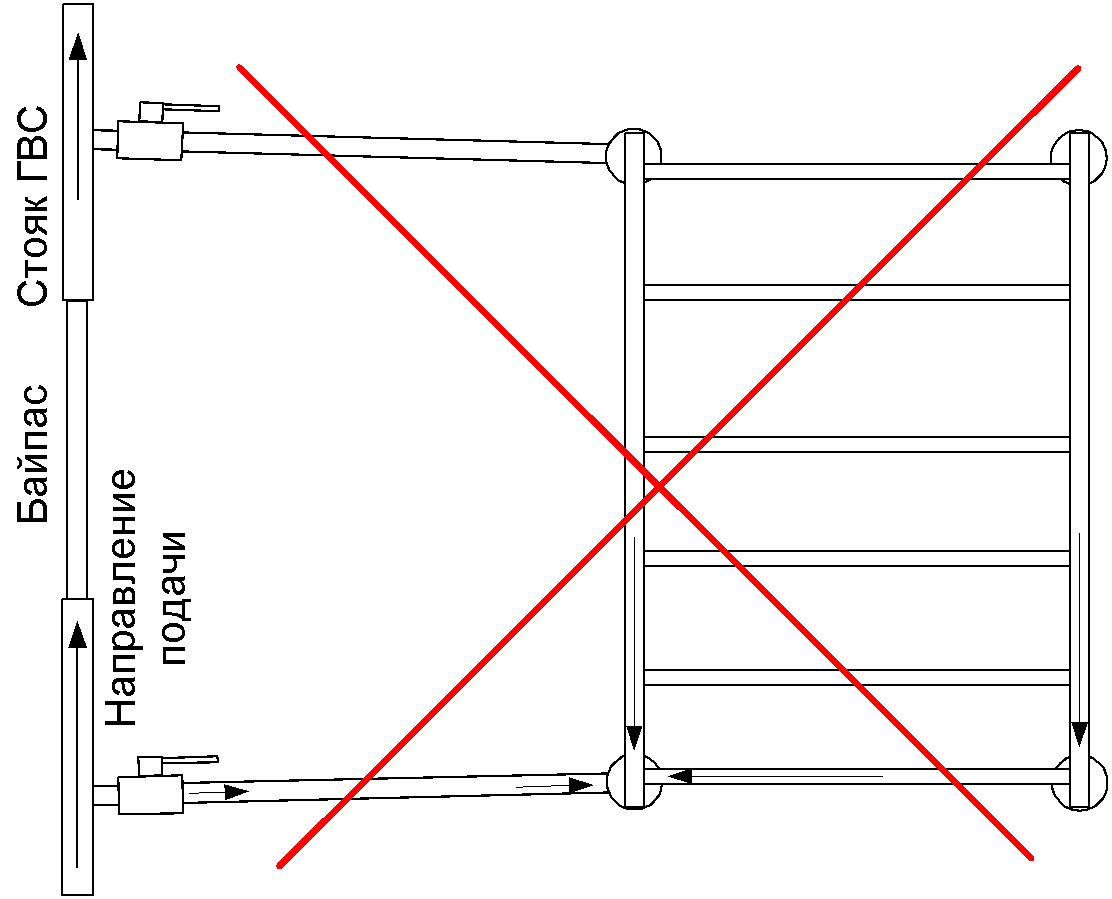 Низ прибора находится между отводами. При нижней подаче в стояке, малой высоте полотенцесушителя или большом расстоянии между отводами эта схема может не работать или работать нестабильно.