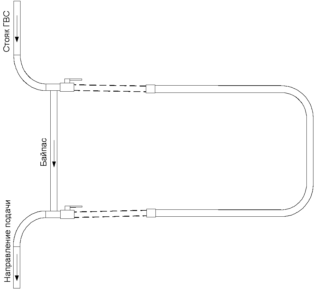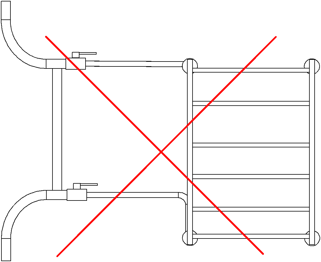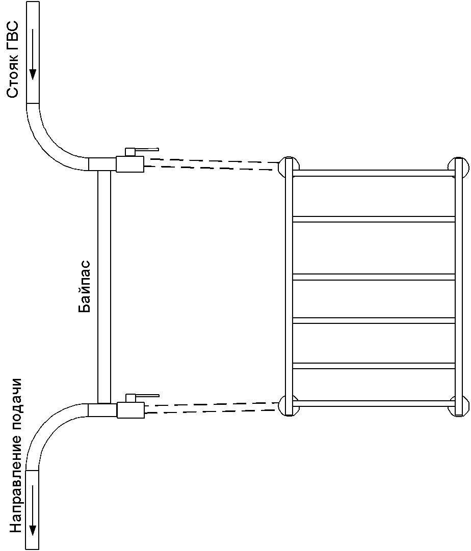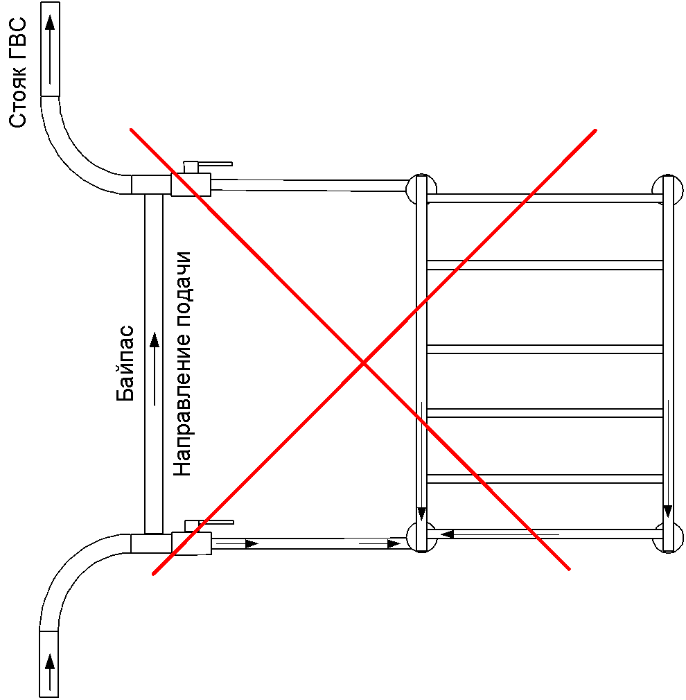 Низ прибора находится между отводами. При нижней подаче в стояке, малой высоте полотенцесушителя или большом расстоянии между отводами эта схема может не работать или работать нестабильно.