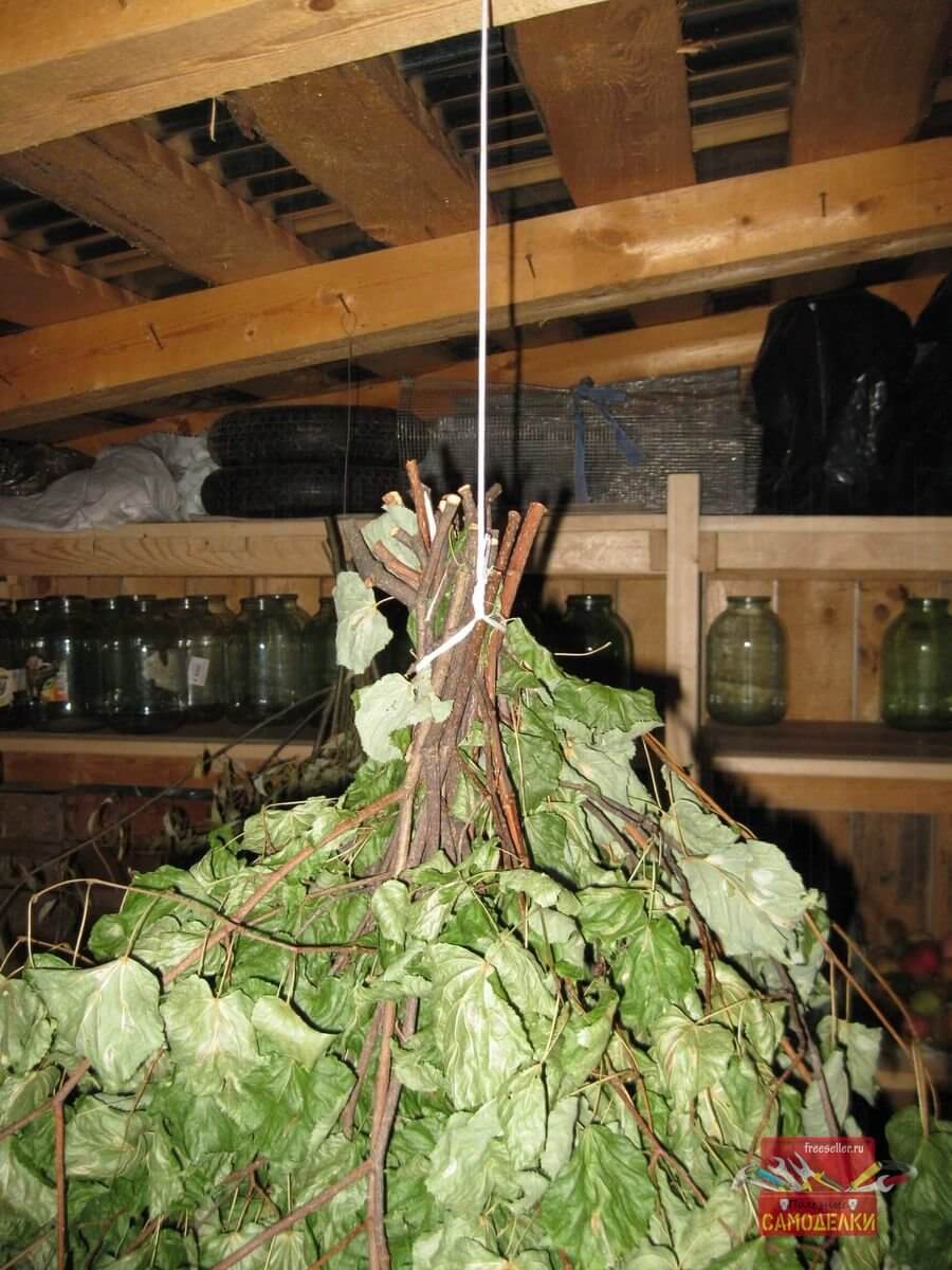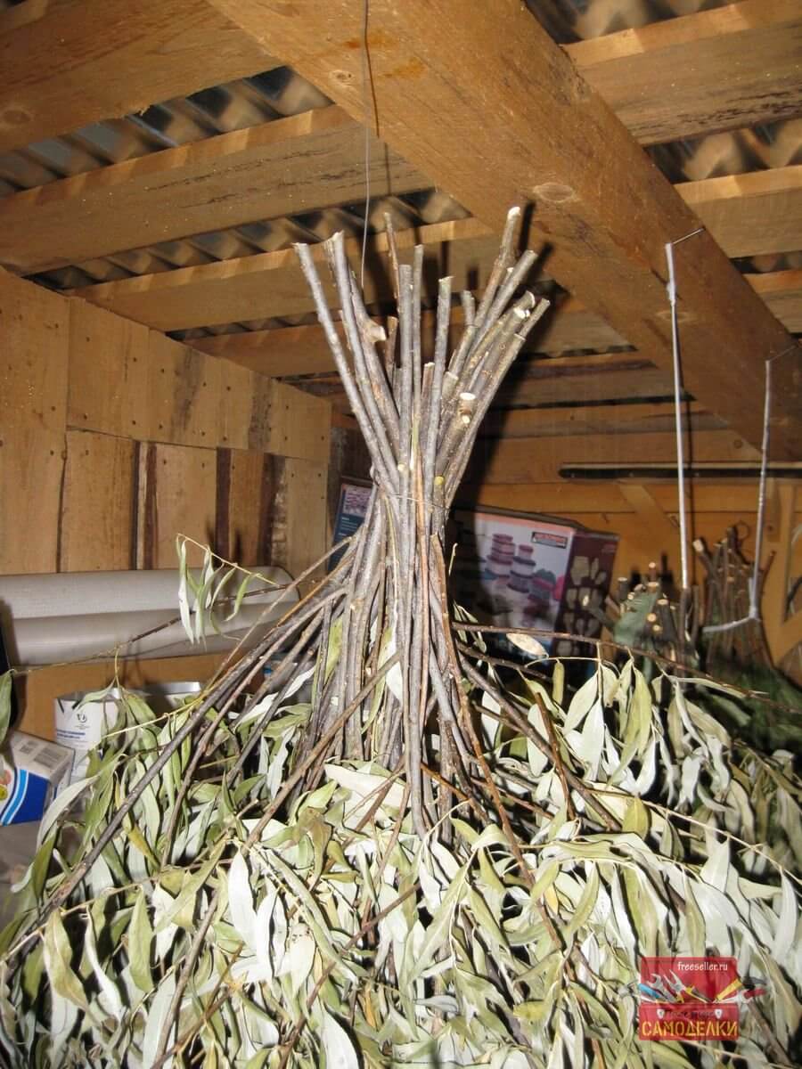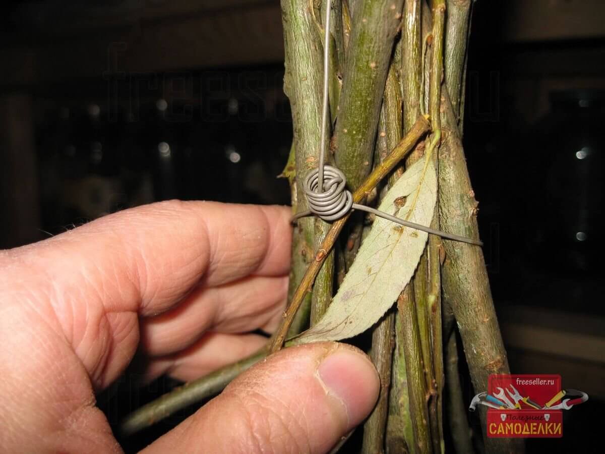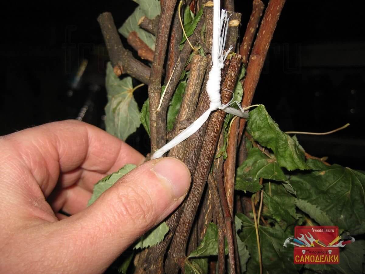 С одного конца этого подвеса делается незатягивающаяся петля, чтобы веник можно было подвешивать к потолочной балке сарая, а с другой, затягивающаяся петля-удавка, которая стягивает и фиксирует сам пучок веток.