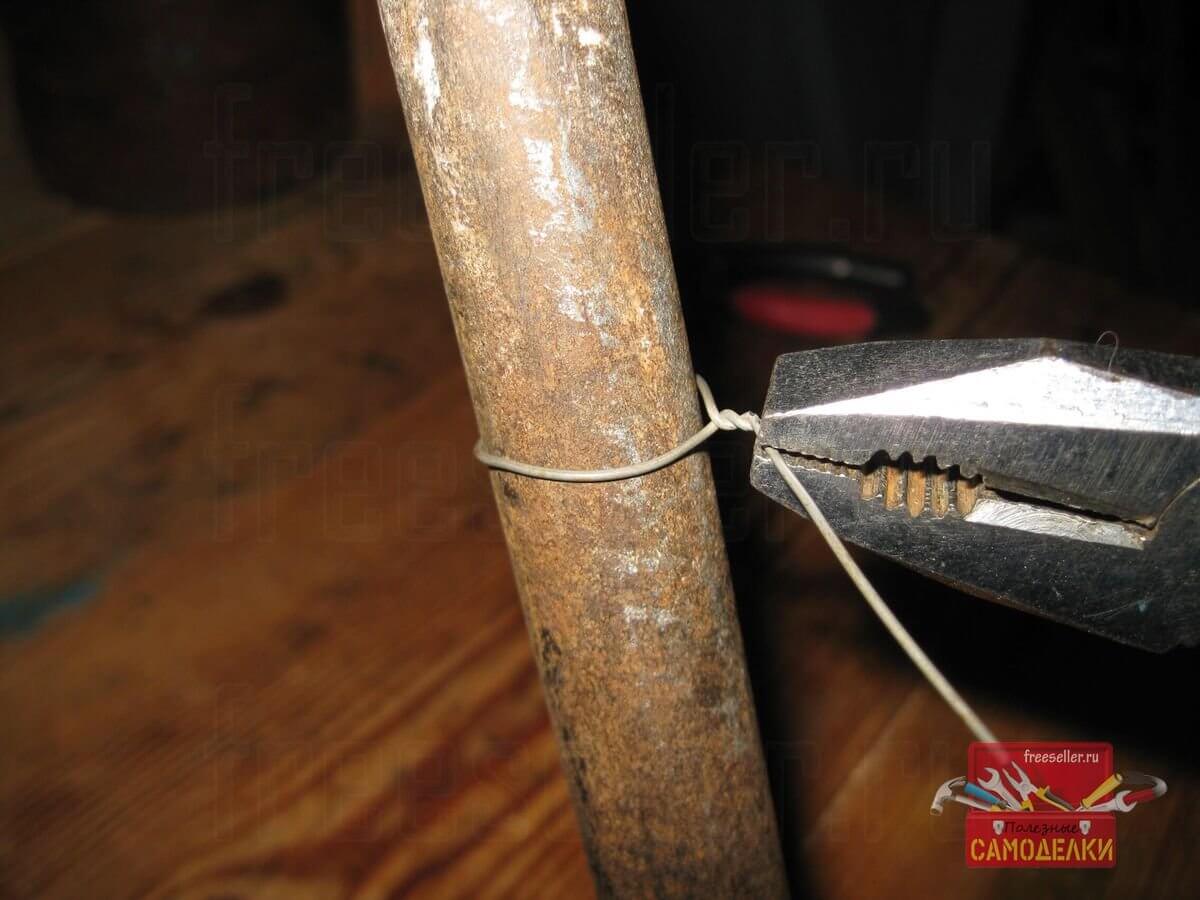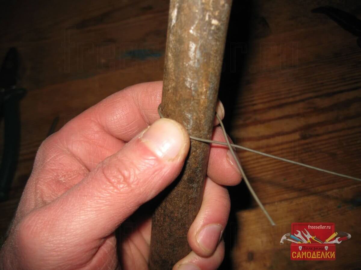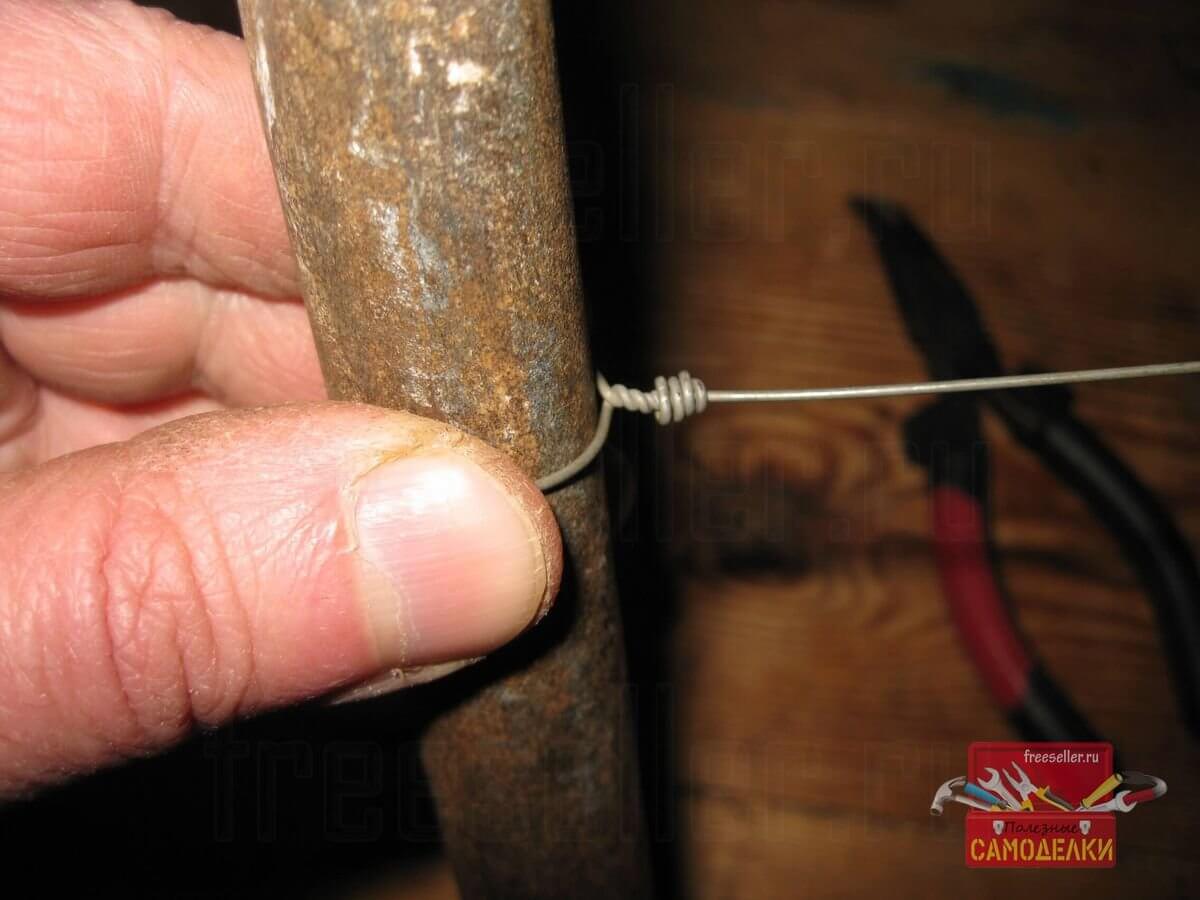 Сначала я обернул вокруг костыля другой конец проволочного отрезка, так, чтобы остался свободный кончик длиной 7-8 см.