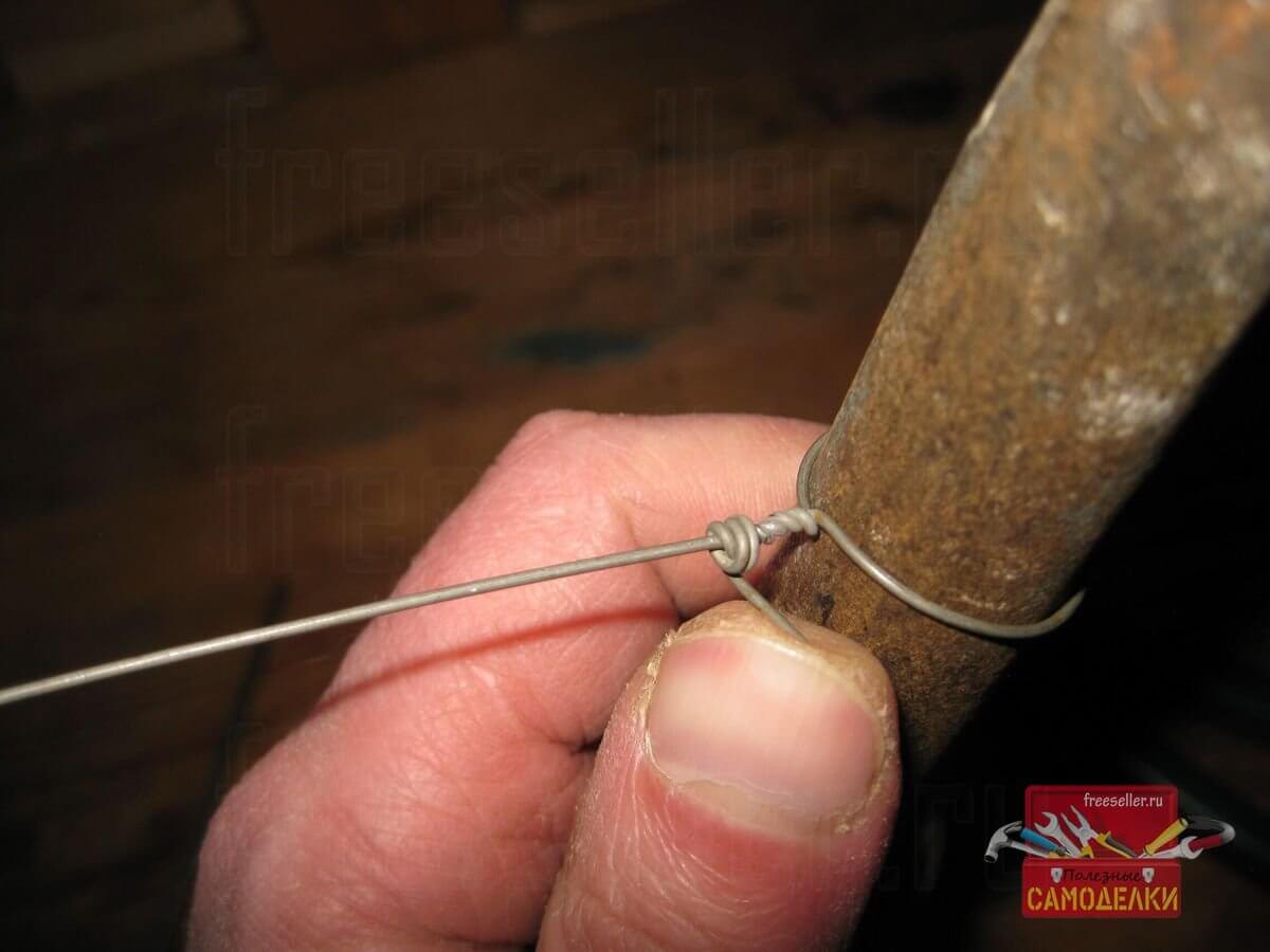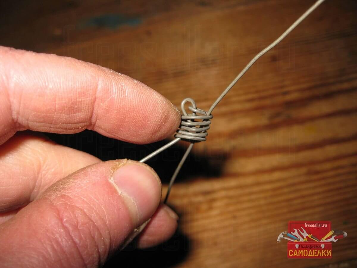 И начал обматывать вокруг него и, соответственно вокруг маленькой петли, правый свободный конец проволоки.