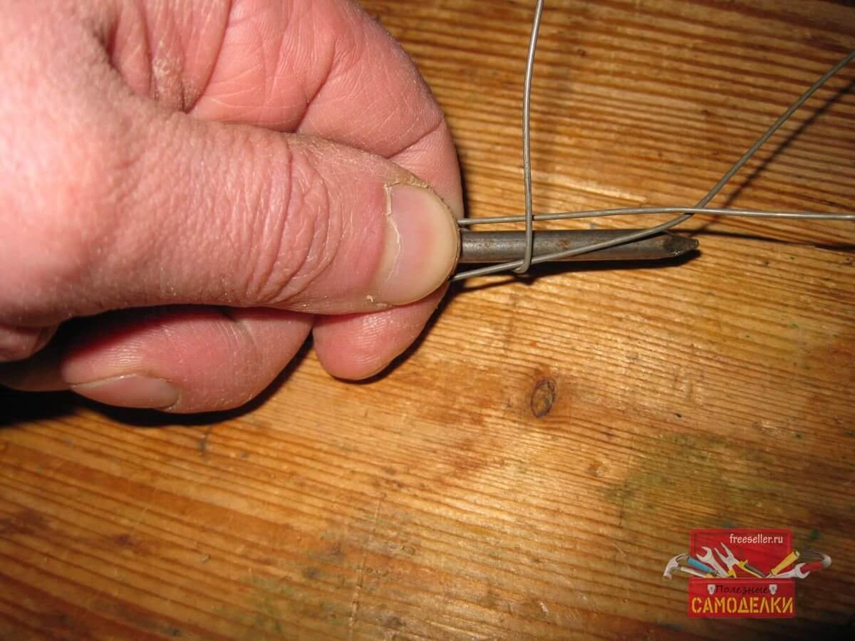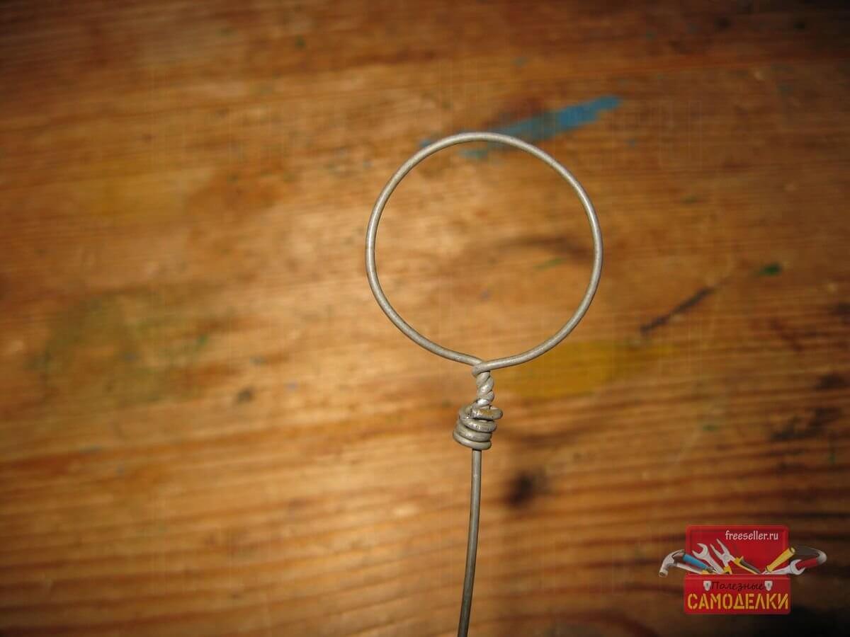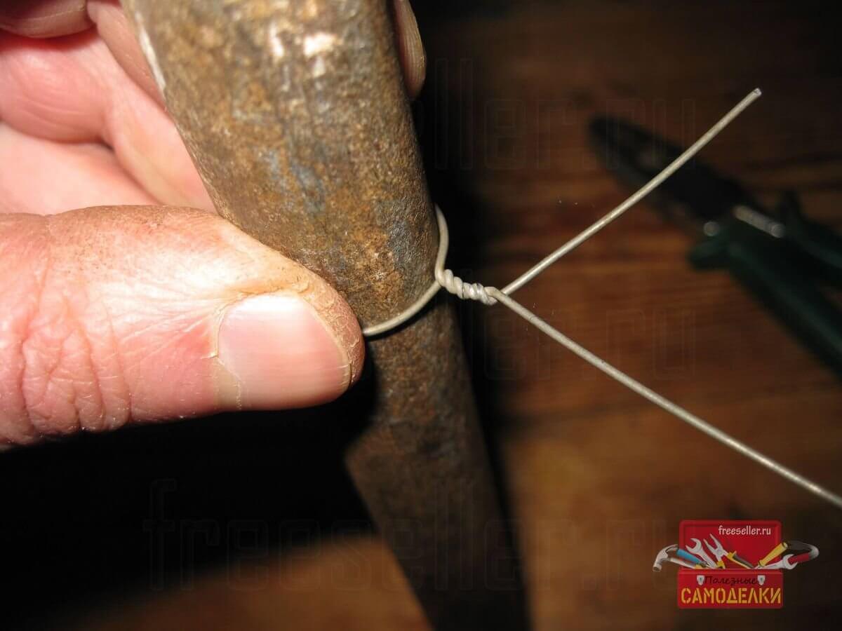 После этого, на другом конце проволоки, я стал делать незатягивающуюся петлю, а точнее, кольцо, которое будет использоваться для двух целей: во-первых, для удержания проволочного подвеса пальцем, во время затягивания петли на венике, а во-вторых, для подвешивания веника к потолку на гвоздь или крючок.