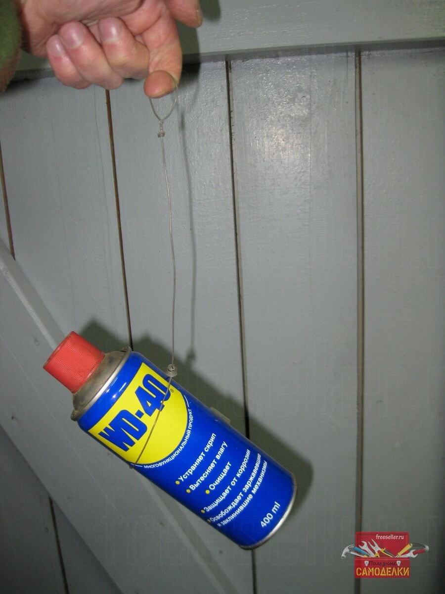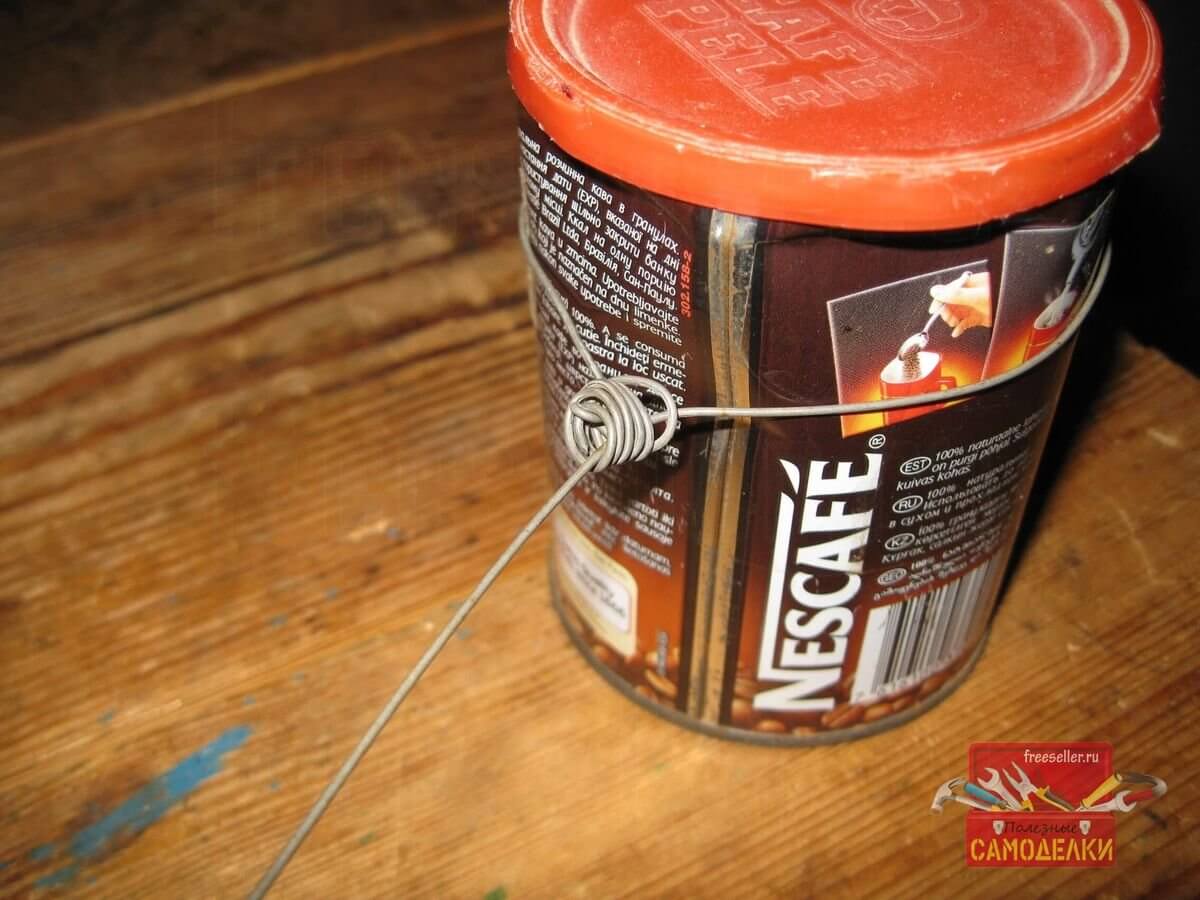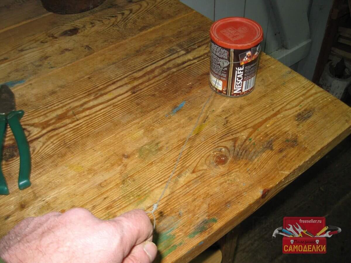 Для этого, я надеваю петлю на какой-нибудь круглый в сечении предмет, например, на консервную банку и, удерживая банку одной рукой, затягиваю петлю, потянув подвес за проволочное кольцо, пальцем другой руки.