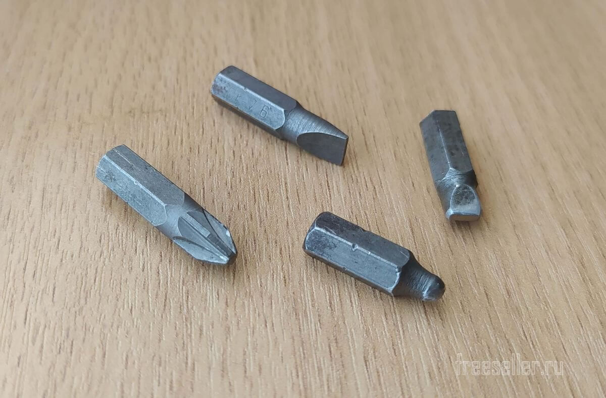 Давящую головку сделал из бит для шуруповёрта. Обточил и закруглил края жала у плоской и крестообразной биты.