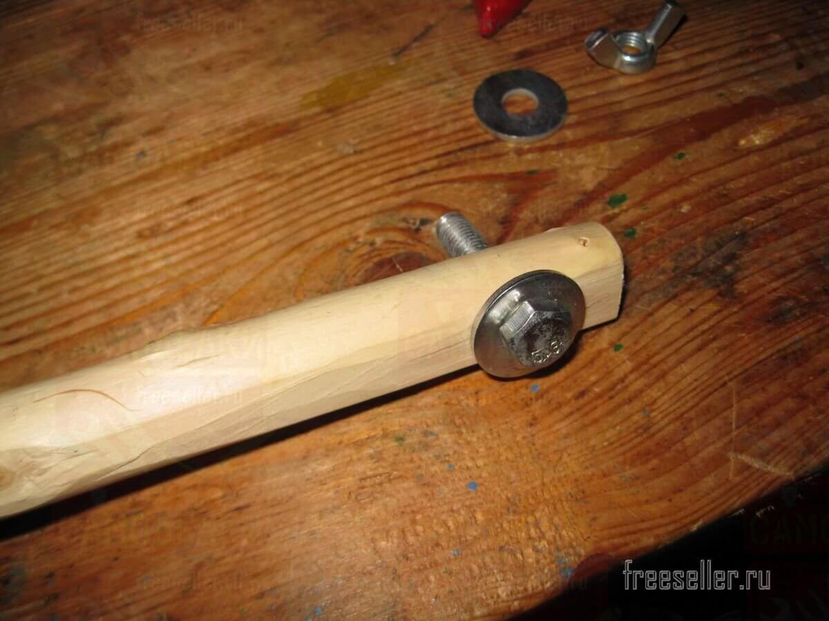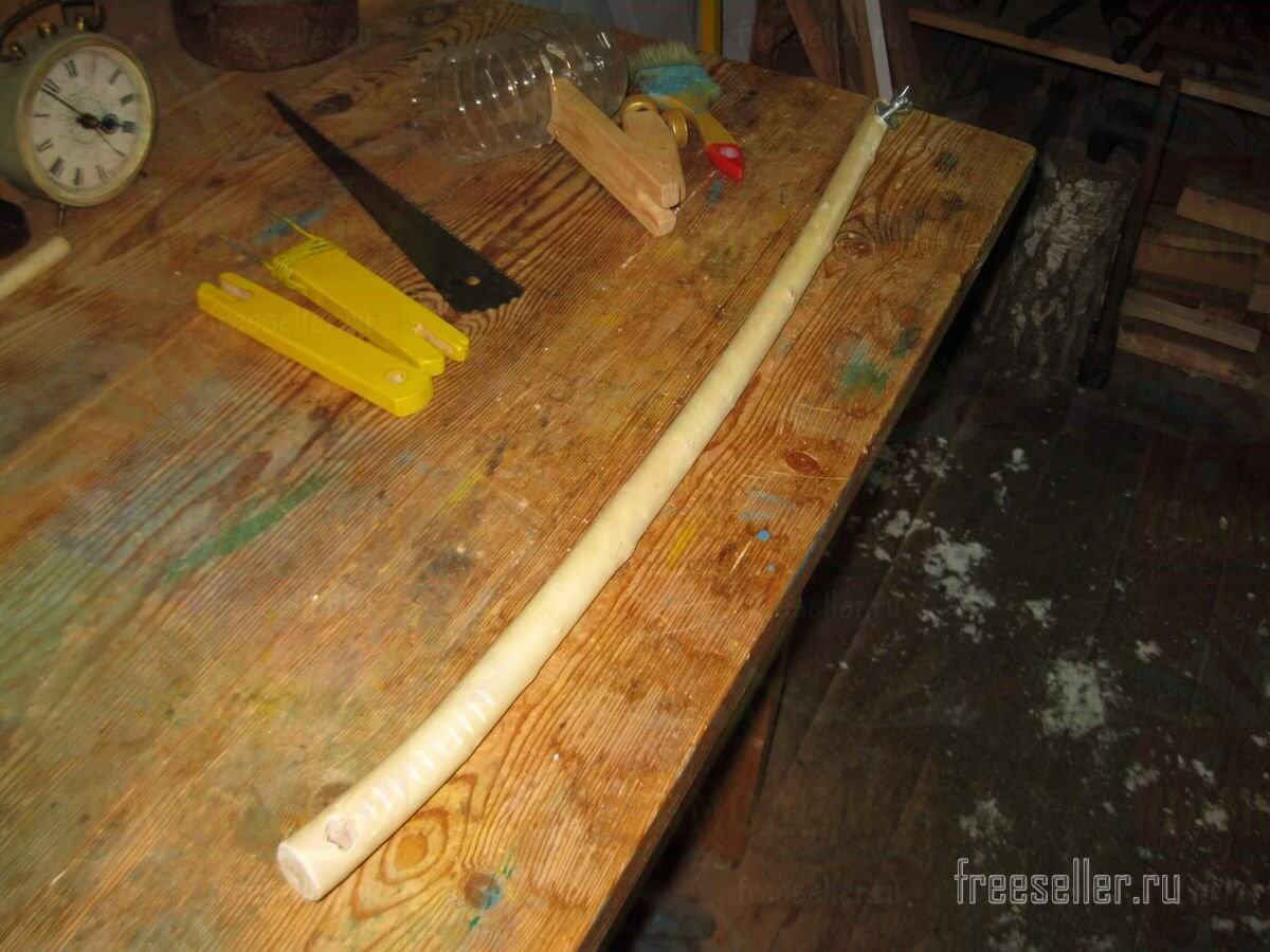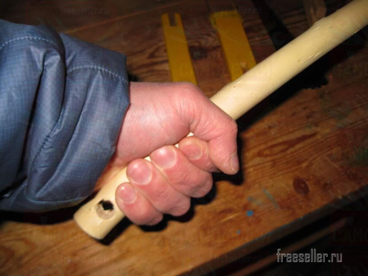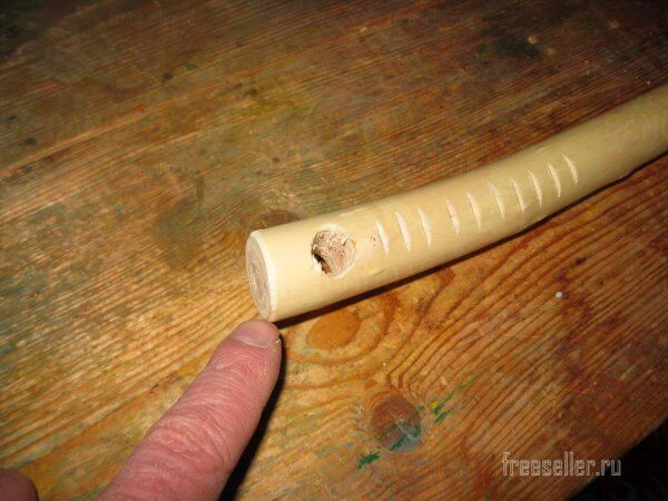 Затем, при помощи напильника по дереву с острой кромкой, я сделал на толстом конце рукоятки насечки, для того, чтобы рукоятку было удобнее держать рукой.