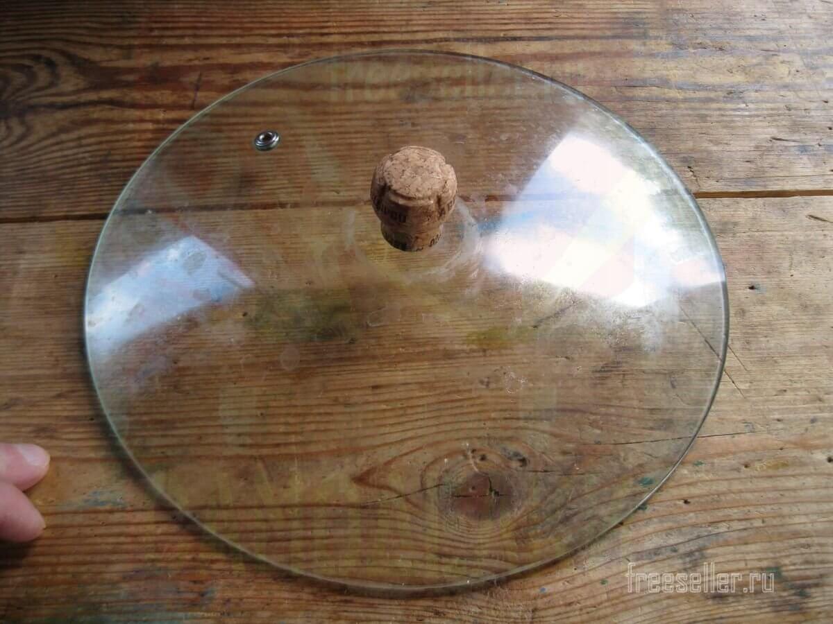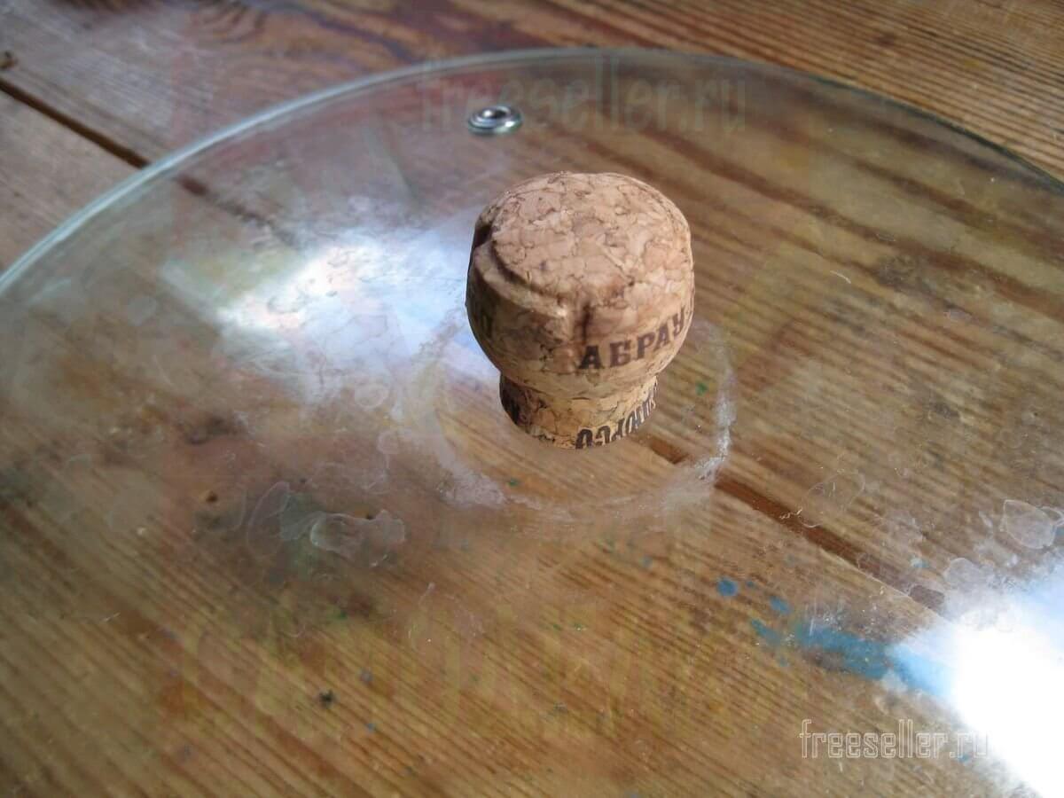 Очень простой вариант быстро починить крышку сковородки со сломанной ручкой, установив на нее вместо старой ручки, отрезок пробки от бутылки шампанского.