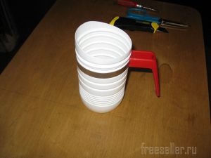 Самодельная кружка-совок для сыпучих продуктов. Удобная кружка-совок для зачерпывания и насыпания различных сыпучих продуктов (круп, семечек, комбикорма и т.п.), сделанная из пластиковой бутылки и рукоятки от старого стеклянного чайника....