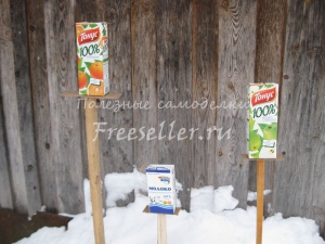 Очень простые в изготовлении мишени, также выполняющие роль пулеулавливателей, сделанные из картонных пакетов из-под молока или сока. Мишени устанавливаются на подставки и при попадании, падают на землю....