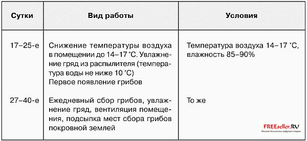 С момента появления грибов помещение нужно тщательно проветривать, не допуская, однако, сквозняков и вообще интенсивного движения воздуха. Для поддержания постоянной влажности воздуха 85-90 % можно увлажнять пол помещения, если он цементный, или ставить емкости с водой.
