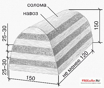 Солома должна быть чистой, без следов плесневения, с участков, не обработанных пестицидами. Подготовка компоста состоит из нескольких этапов. Сначала замачивают солому на сутки в каком-либо резервуаре или просто обильно поливают ее водой из шланга или из ведра. Затем солому и навоз укладывают в штабель слоями, так, чтобы в нем было не менее 3-4 слоев навоза и 3-4 слоев соломы. Каждый слой соломы дополнительно слегка увлажняют и посыпают мочевиной или аммиачной селитрой, приблизительно по 600 г на слой, чтобы на все 100 кг соломы пришлось 2,5 кг удобрения.