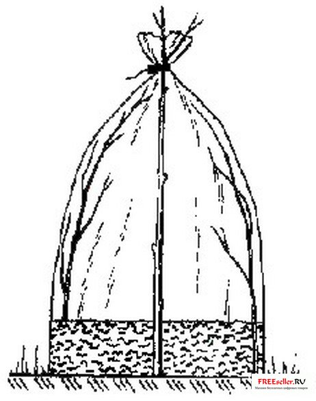 Отрезаем кусок полиэтиленового "рукава" длиной примерно 1,5 м, расправляем его и одеваем на "забор" как чулок, натягивая до земли. Нижнюю часть «рукава», натянутую на прутья, расправляем от морщин, верхнюю часть расправляем. Снаружи укрытия по тому же кругу вбиваем между прутиками колышки высотой 50 см, чтобы в дальнейшем пленку не распирало землей.