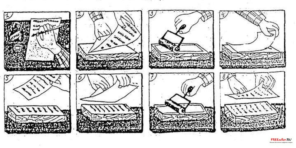 Как же был устроен этот прибор, дважды за последние сто лет, попадавший под запрет? До смешного просто. Обыкновенная кювета из, металла или фаянса размером чуть больше листа писчей бумаги. Заполнялась она студенистой массой, приготовленной из желатина. На ее поверхность накладывали написанный чернилами оригинал, прокатывали папином, а затем снимали. Большая часть чернил прилипала к поверхности массы. Затем на нее накладывался чистый лист, прокатывался валиком и копия готова. Вот и вся множительная техника!