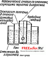 Золочение без внешнего источника тока Контактное золочение применяется для получения очень плотных и равномерных покрытий, отличающихся высокой прочностью сцепления, и если не требуется большая толщина покрытия. Электролиз этим методом не нуждается в источнике внешнего тока. Разность потенциалов, необходимая для осаждения золота, создается гальваническим элементом, в котором катодом служит покрываемое изделие, погруженное в электролит золочения, а анодом - цинковая пластинка, находящаяся в концентрированном растворе поваренной соли и соединенная с изделием проволокой, как показано на рис. 1. Для электролиза может применяться любой подогретый электролит золочения из числа указанных в таблице.