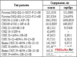 • Формулярное содержание драгоценных металлов в некоторых разъемах;